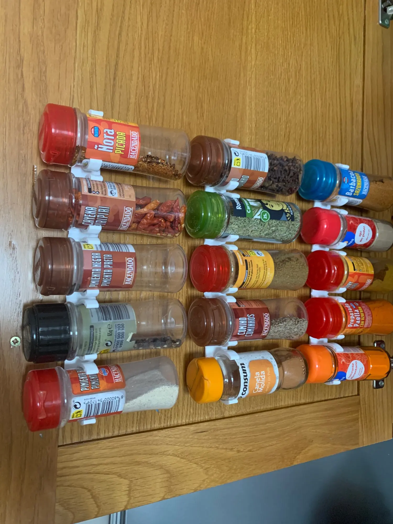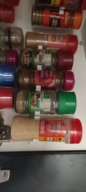 Идея очень хорошая, потому что заказанные специи остаются и не мешают. Но он взлетает; Я очень хорошо почистил область спиртом и приклеил ее, я позволил ей выровнять, а затем на следующий день я положил бутылки специй, мой сюрприз был, когда через два дня он оторвался, а не от клея к двери, Если не стелька, она сделала свой собственный клей (видно на прилагаемом изображении). Жаль, так как мне очень нравится, как все заказано, Я постараюсь решить это, положив несколько маленьких винтов, чтобы он подходил к двери, и поэтому он не упадет (но потому что мое Мебель старая, и мне все равно) И действительно идея хорошая, Но если это невозможно, ищите другой вариант, потому что он взлетает (и что лодки, которые я положил, были пластиковыми, и они едва весили ничего). Они должны улучшить качество клея, если он лучше прилипает, я бы не стал платить немного больше, так как он очень хорошо решает проблему заказа и пространства, если вы используете много специй при приготовлении пищи. U