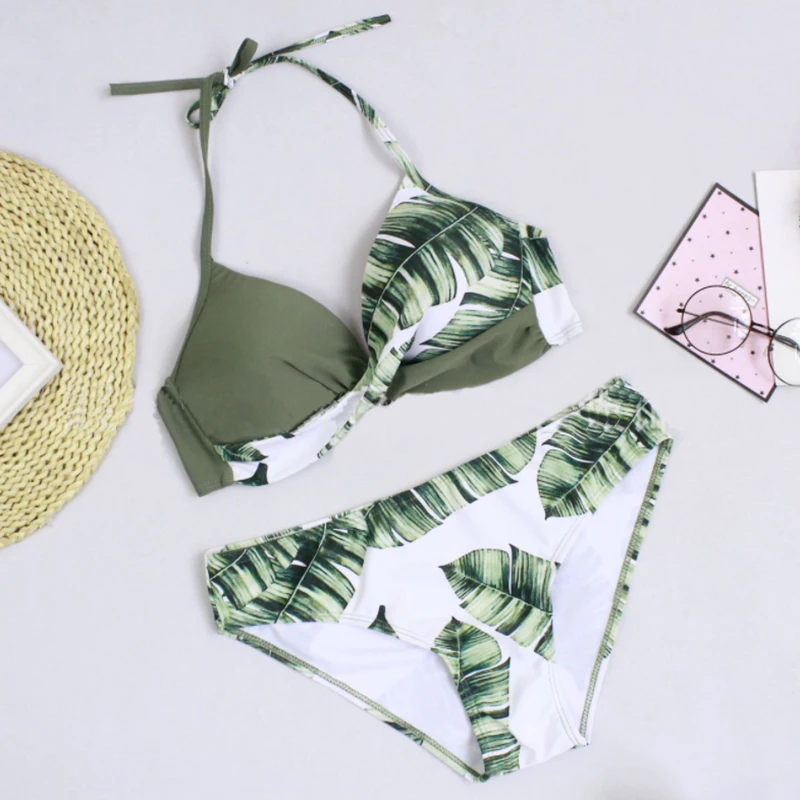 Большое женское бикини, женский купальник на бретельках с лиственным принтом, Раздельный пляжный женский сексуальный купальник бикини с зелеными листьями