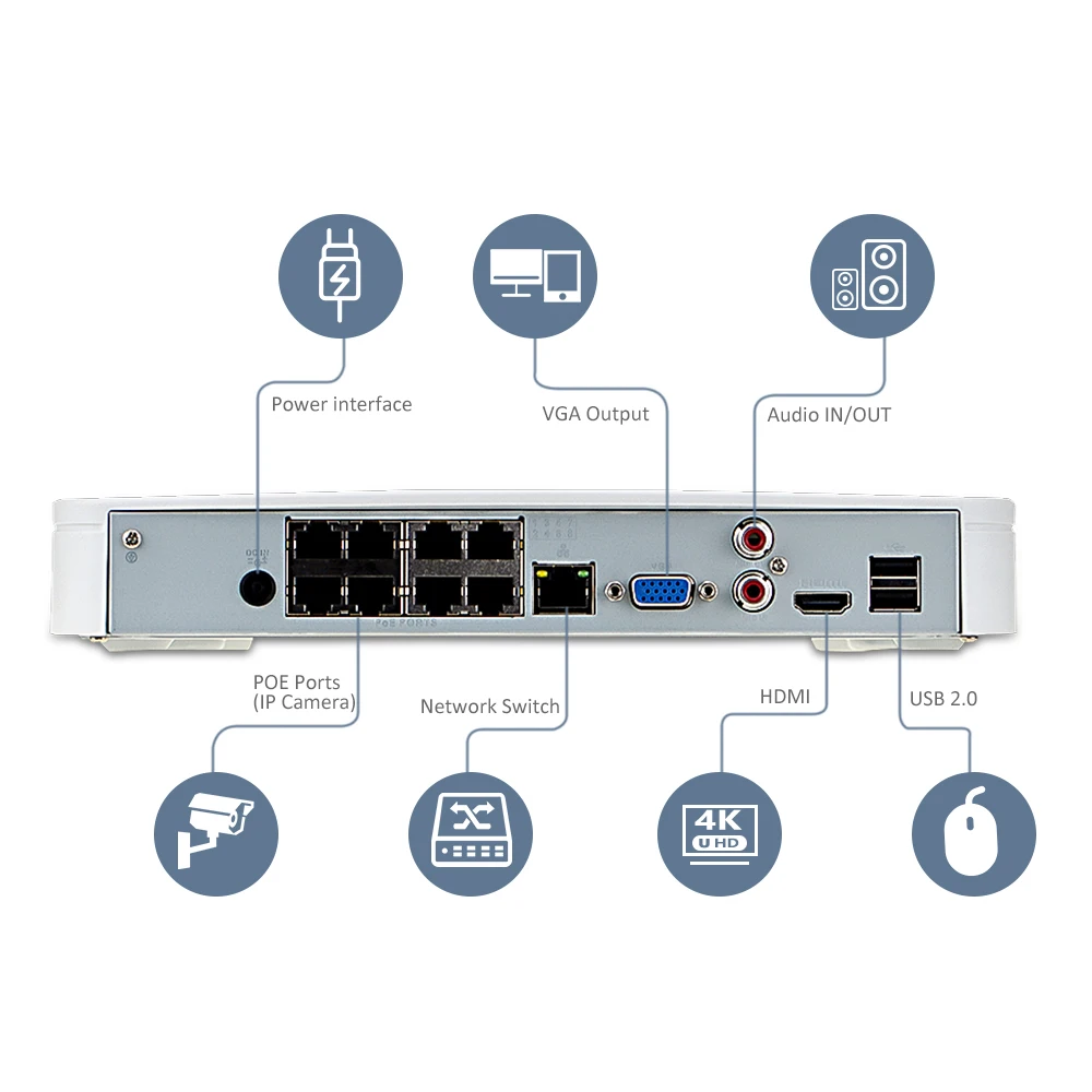 > Smart H.265 +/H.265/Smart H.264 +/H.264> Максимальная входящая полоса пропускания 80 Мбит/с> Разрешение до 8 МП для предварительного просмотра и воспроизведения> До2ch @ 4K/8ch @ 1080PДекодирование> /VGA одновременный видеовыход> Поддержка IPC UPnP, 8PoE портов