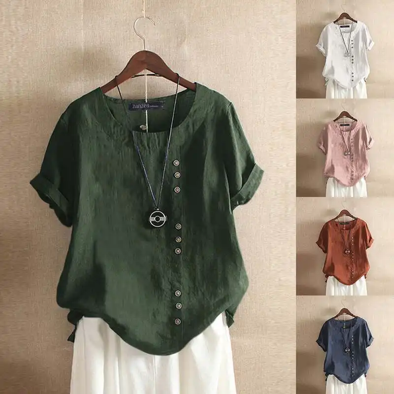 Элегантные топы на пуговицах, женские летние блузки ZANZEA 2022, повседневные блузы с коротким рукавом, Женская туника с круглым вырезом, Однотонная рубашка