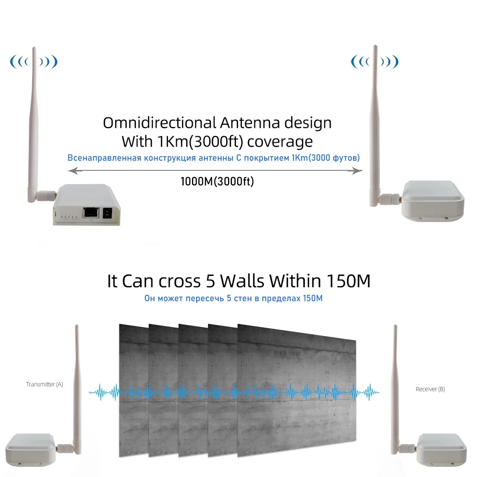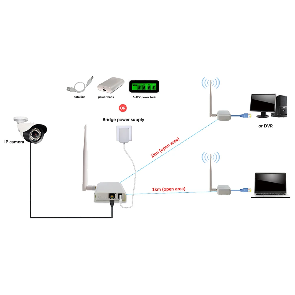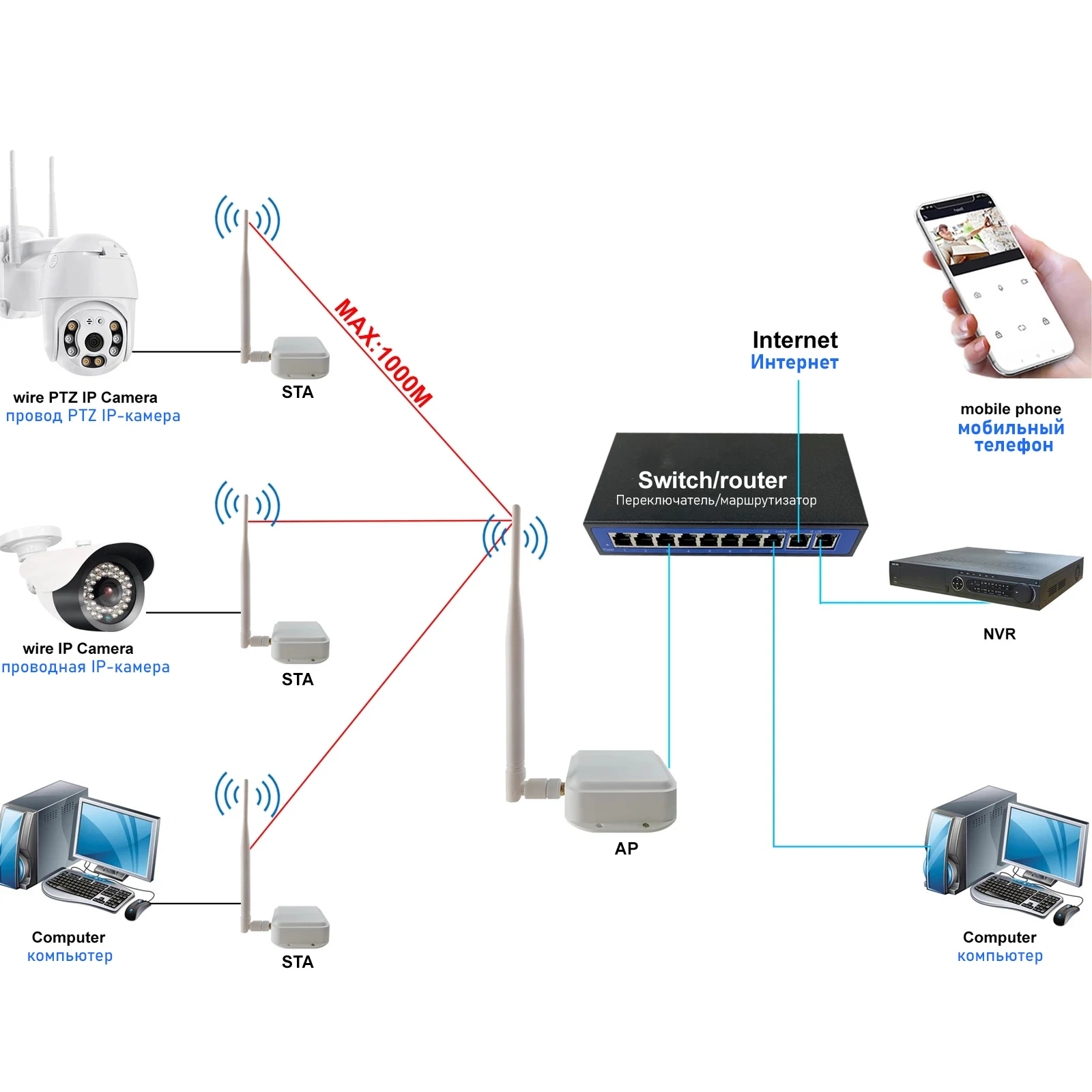 Это альтернатива длинному кабелю между компьютером и маршрутизатором, или NVR и ip-камерами для наблюдения за безопасностью на домиках, фермах, бассейнах и т. д. С большим расстоянием до 3000 футов в открытом пространстве.
