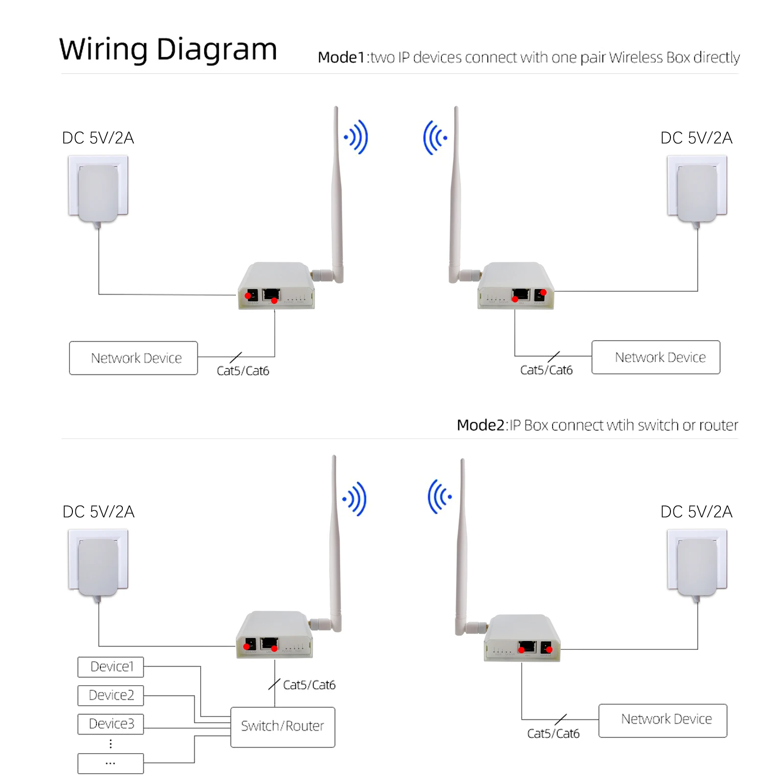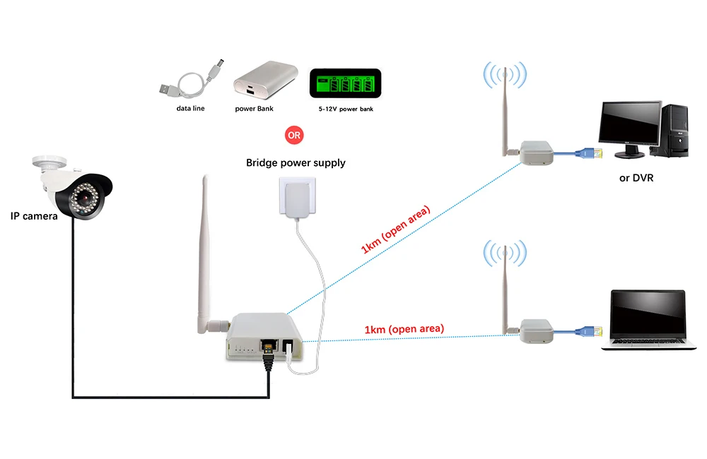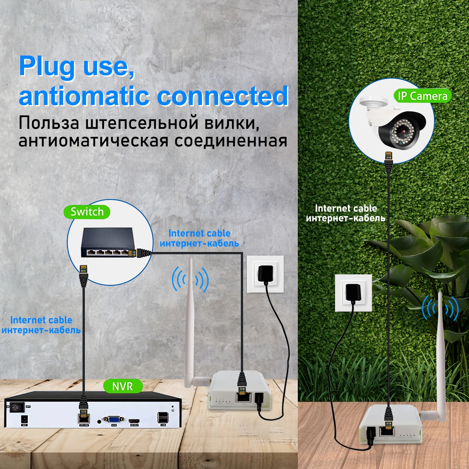 Это альтернатива длинному кабелю между компьютером и маршрутизатором, или NVR и ip-камерами для наблюдения за безопасностью на домиках, фермах, бассейнах и т. д. С большим расстоянием до 3000 футов в открытом пространстве.