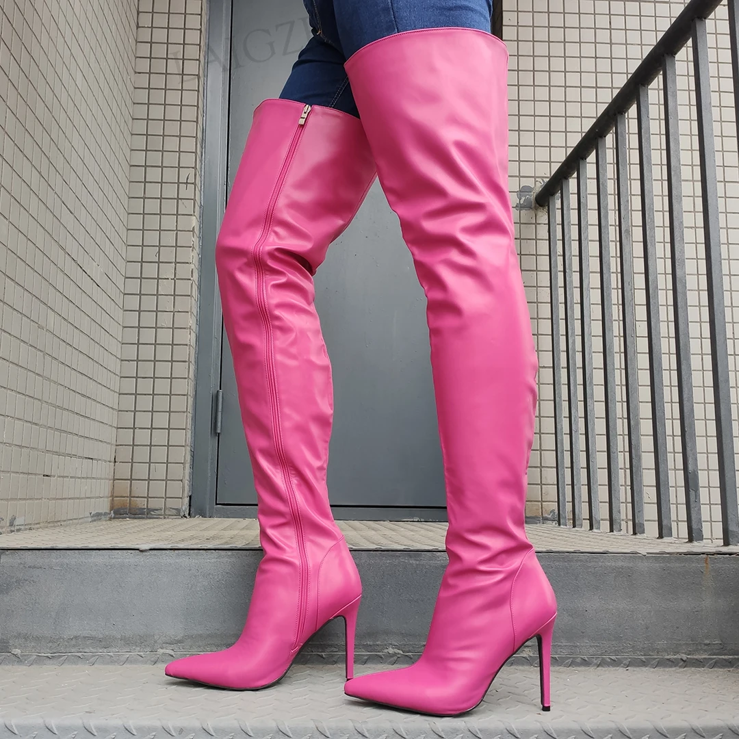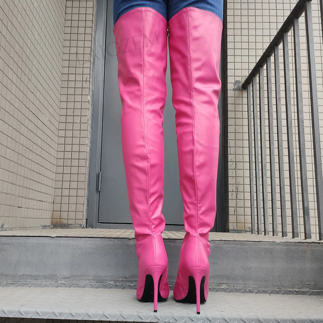 LAIGZEM/Модные женские облегающие высокие сапоги; Сапоги на высоком каблуке-шпильке на молнии; Сапоги выше колена из искусственной кожи; Женская обувь; Большие размеры 42, 44, 46, 47