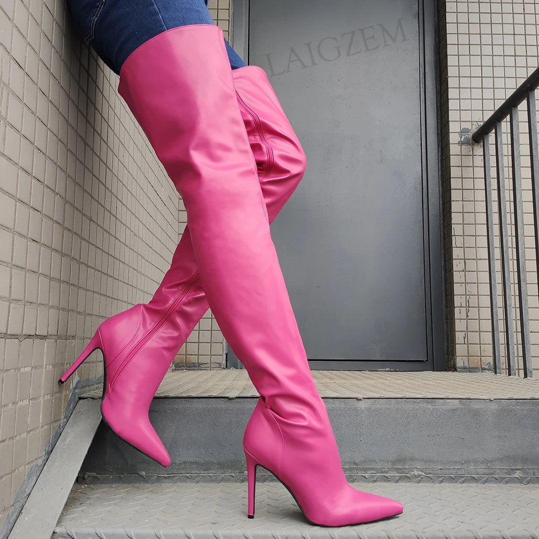 LAIGZEM, модные женские ботинки на высоком тонком каблуке на молнии; Обувь на высоком каблуке-шпильке; Женские Сапоги выше колена из искусственной кожи женская обувь, большой размер 42, 44, 46, 47 (Европа);