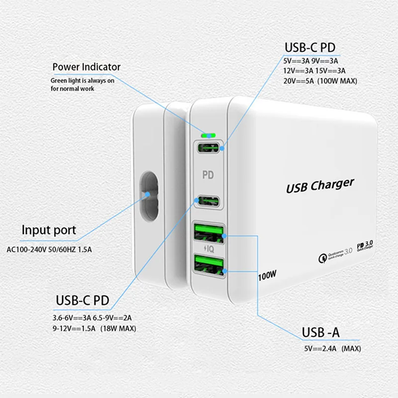 Вход: AC 100-240V 50-60Hz 1.5A Выход USB C PD 100 Вт: 5 В, 3 А, 9 В, 3 А, 12 В, 3 А, 15 В, 3 А, 20 в, 5 А Выход USB C PD 18 Вт: 3,6-6 в/3 А, 6,5-9 В/2 А, 9-12 В/А Выход USB-A: 5 В, 2,4 А макс. Общая мощность: макс. 100 Вт Примечание: Это зарядное устройство не поддерживает несколько устройств. Если вам интересно, поддерживает ли зарядное устройство быструю зарядку вашего устройства, пожалуйста, свяжитесь с нами!
