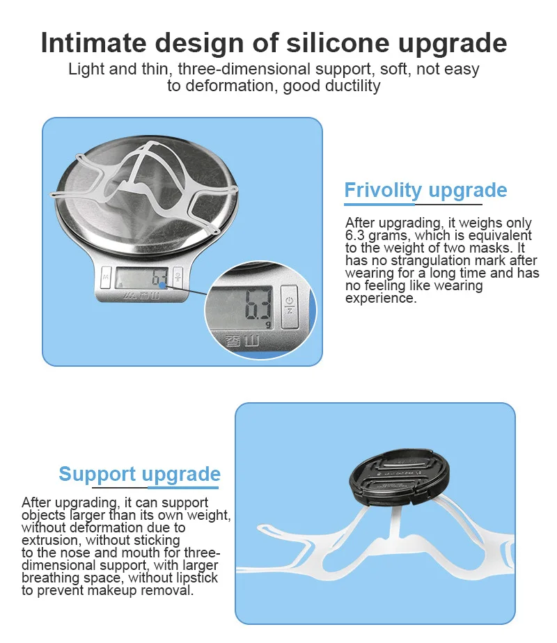 Поддержка обновления: после обновления, он может поддерживать предметы больше, чем его собственный вес, без деформации из-за экструзии, трехмерной поддержки, не прилипает к носу и рту, больше дышащего пространства, нет помады, чтобы предотвратить удаление макияжа.