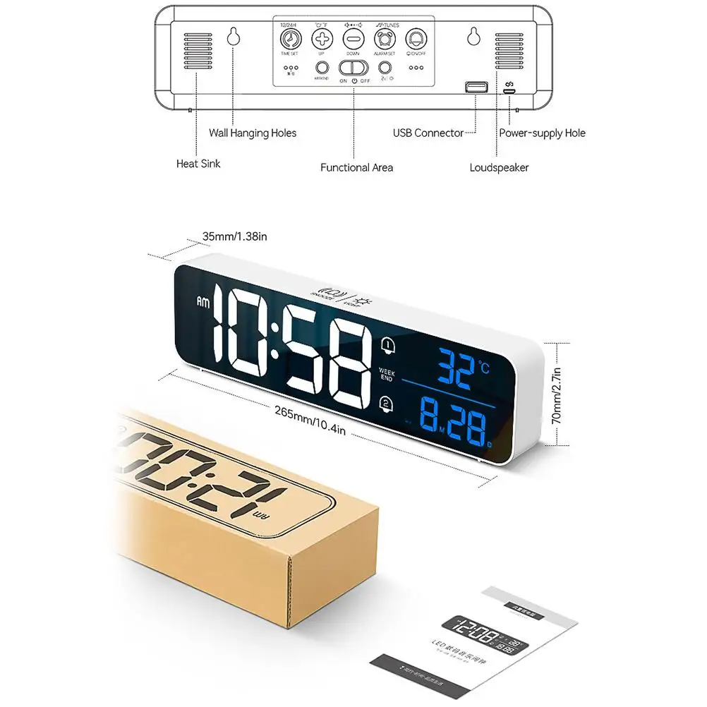 Светодиодный цифровой будильник, перезаряжаемый дисплей с отображением температуры и даты, настольные зеркальные часы, Домашний Настольный прикроватный декор, электронные часы