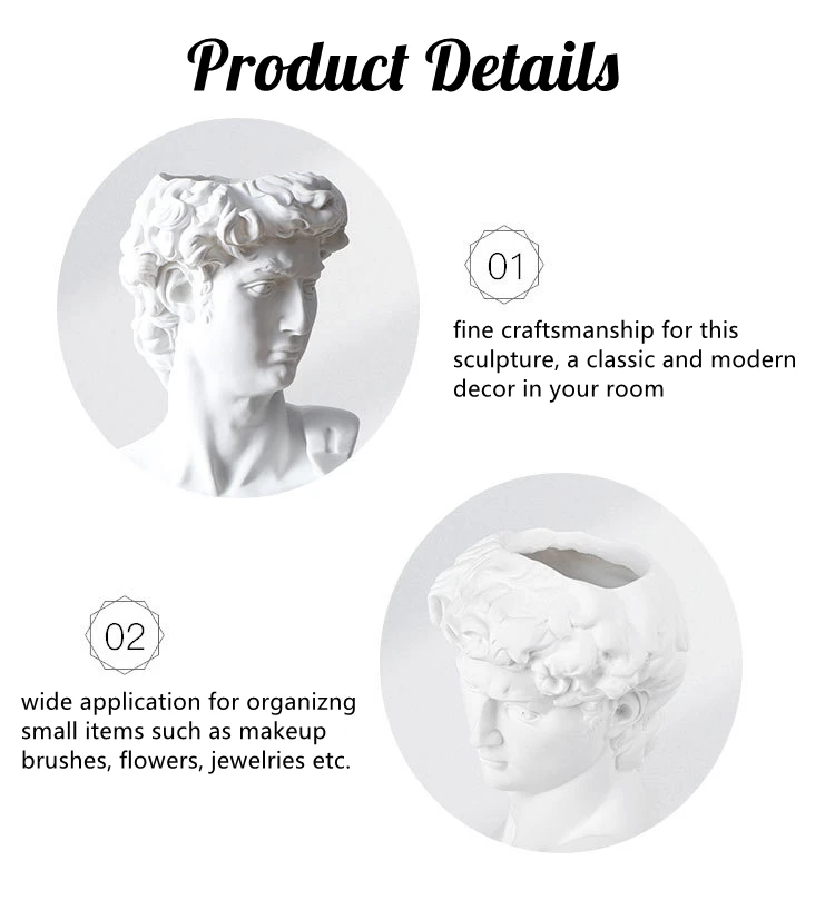 Характеристики:Материал: смолаРазмер: средний размер (7 * 12c) Большой размер (9x16 см)Цвет: белыйОсобенности:1. Креативность: Креативный держатель кистей для макияжа. Классические греческие чашечки для макияжа для кистей Michelangelo David Bust Statue. Вы можете положить ваши любимые румяна и помаду на этот красивый. Он является восхитительным украшением для вашего тщеславия.2. Многократное использование: Эта уникальная статуя Давида бюста, подставка для кистей для макияжа, может держать ваши кисти для макияжа, подводку для глаз, тушь для ресниц и аксессуары. Его также можно использовать как вазу, держатель ручки, суккулентный плантатор, комнатный/открытый плантатор, и украсить ваш обеденный стол, ванную комнату, столешницу и офис.3. Материал и размер: изготовлен из прочной смолы; Есть два размера для вашего варианта: средний размер (7 * 12c) Большой размер (9x16 см) (кисти не включены)4. Делает отличный подарок: милый держатель идеально подходит для любителей макияжа или начинающего визажиста в вашей жизни.Примечание:1. Из-за влияния многими факторами, такими как яркость дисплея и светильник яркости, в зависимости от фактического цвета изделия могут быть повреждены во время быть s светильник ly отличаться от показанного на изображении показаны на веб-сайте.2. Пожалуйста, позвольте данным иметь небольшое отклонение от ручного измерения.Посылка включает в себя:1 * декор из смолы