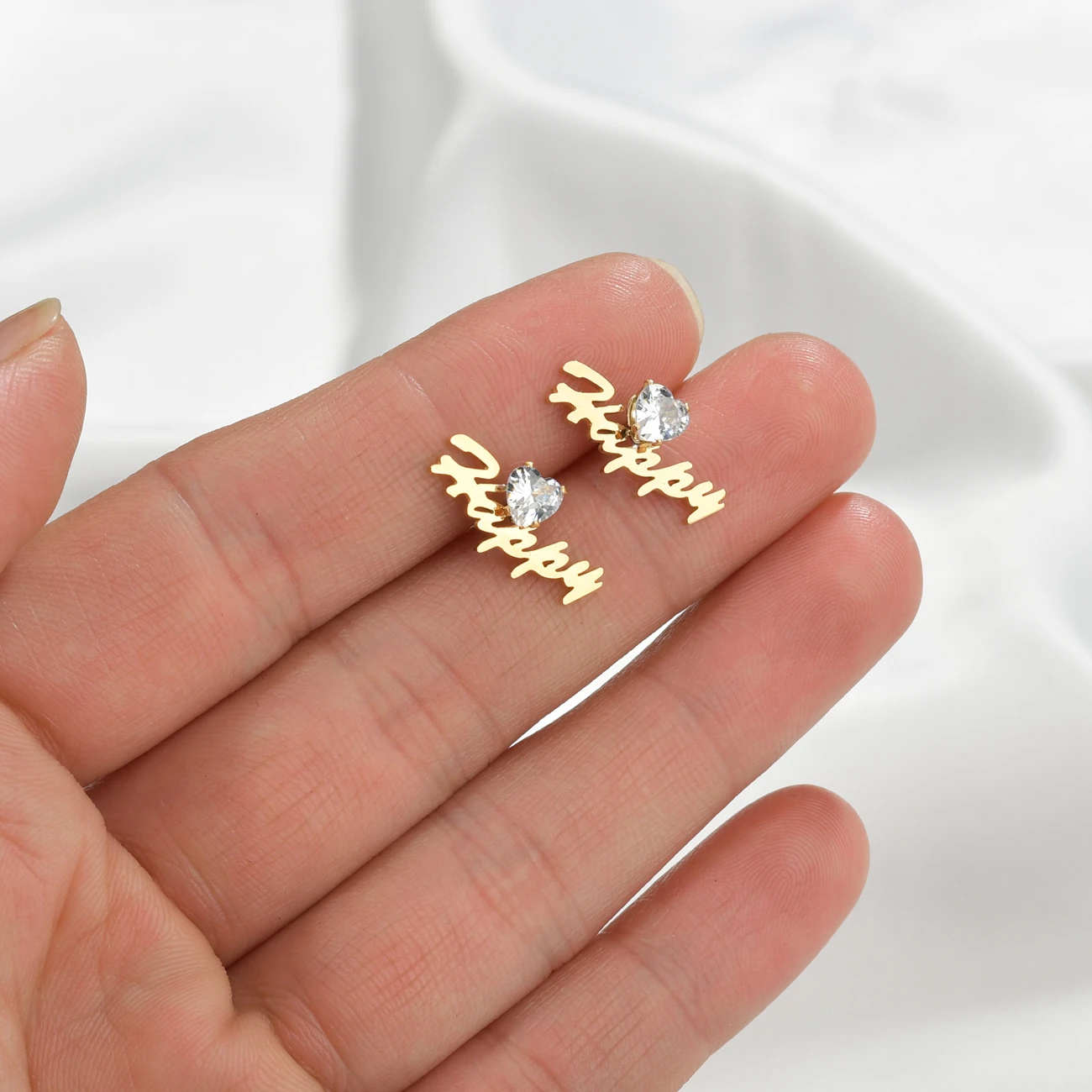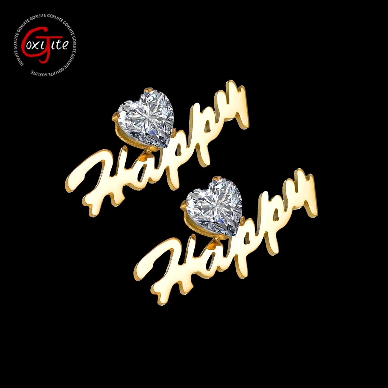 Goxijite персонализированные имя Сердце Циркон серьги-гвоздики в виде капель с кристаллами в форме Для женщин пользовательские Курсив табличка серьги день рождения камень лучший подарок