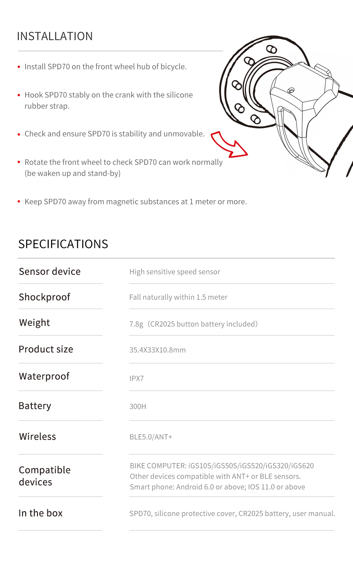1. Название бренда: IGPSPORT2. Номер модели: IGS10S3. Цвет: черный4. Вес: около 58 г5. Физические размеры: 48*75*20 м6. Аккумулятор: около 30 ч7. Объем памяти: около 250 часов8. Секундомер и аксессуары: Беспроводной Секундомер9. Беспроводная связь: Bluetooth 5,0/ANT +10. Водонепроницаемость: IPX611. Рабочая температура: -10 ° ~ 50 ° C12. Интерфейс: Micro USB13. GPS: GPS + BEIDOU + QZSS14. Дополнительные аксессуары: Переднее Крепление для велосипеда, монитор сердечного ритма, датчик скорости, датчик кадра, датчик кадра и скорости комбинированный датчик, измеритель мощности