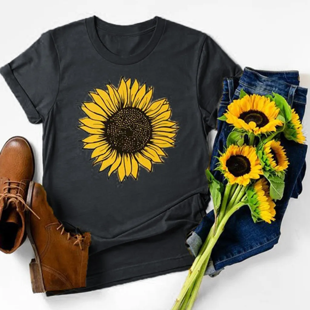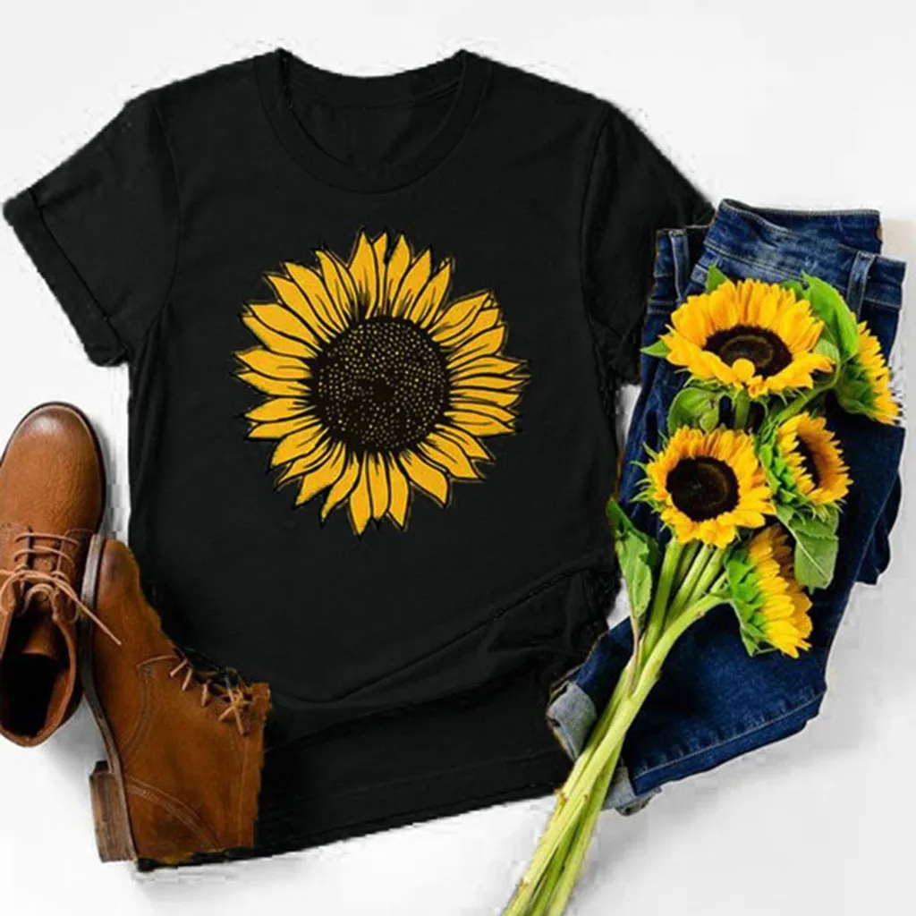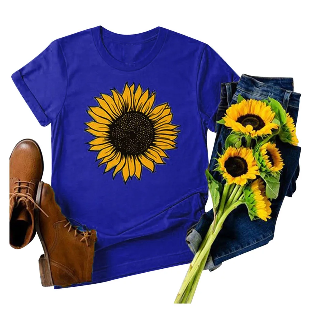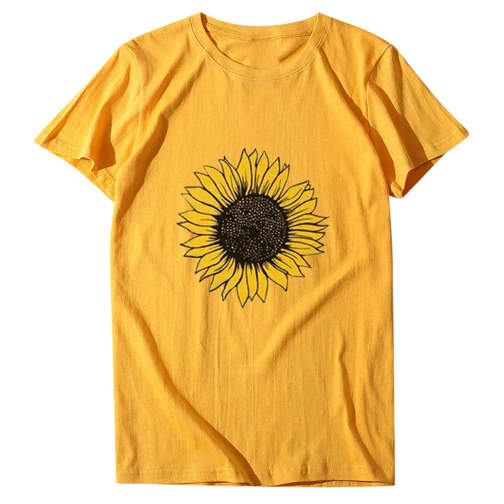 Женские блузки в стиле Харадзюку, топы для женщин, летняя женская блузка с круглым вырезом и принтом подсолнуха, с коротким рукавом, топы, женские рубашки