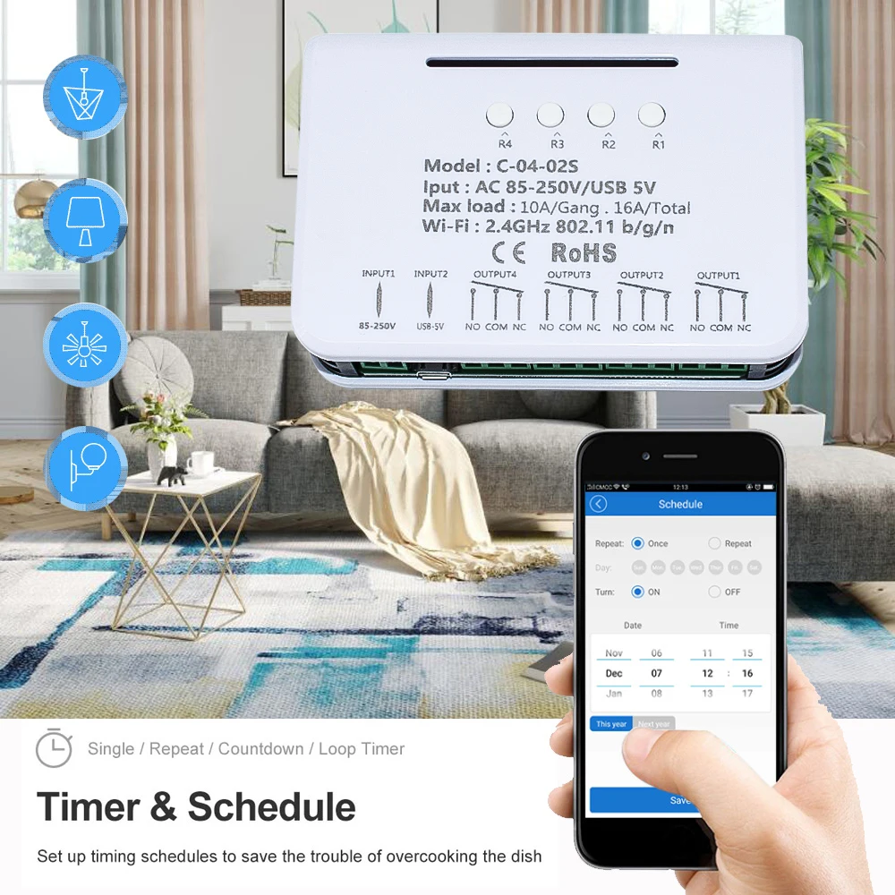 * Поддерживает сеть Wi-Fi. Поддерживает многочисленные смарт-переключатели Wi-Fi на одном смартфоне.* Поддерживает отслеживание состояния: Статус устройства своевременно предоставляется EWeLink.* Поддерживает Удаленное включение или выключение подключенных приборов, например светильник, электрический чайник, электрическая рисоварка, электрический занавес и т. Д.* Поддерживает Макс 8 включенных таймеров по расписанию/обратному отсчету/циклу для каждого устройства.* Голосовое управление: совместимость с "Amazon" Alexa, для Google Home/Nest, IFTTT