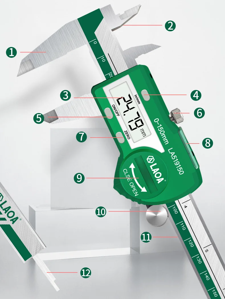 1. Измерение внешнего диаметра2. Измерение внутреннего диаметра3. ЖК-дисплей4. Метрический/дюйм5. Мощность6. Крепежный винт7. Возврат к нулю8. Перевод данных9. Крышка батареи10. Колесо11. 3,5 мм толщина линейка12. Измерение глубины