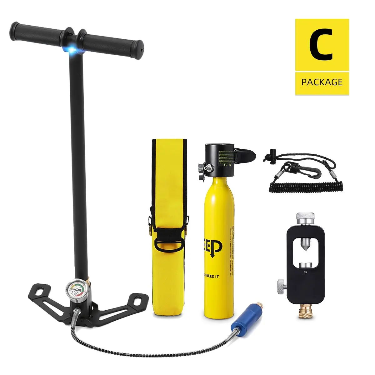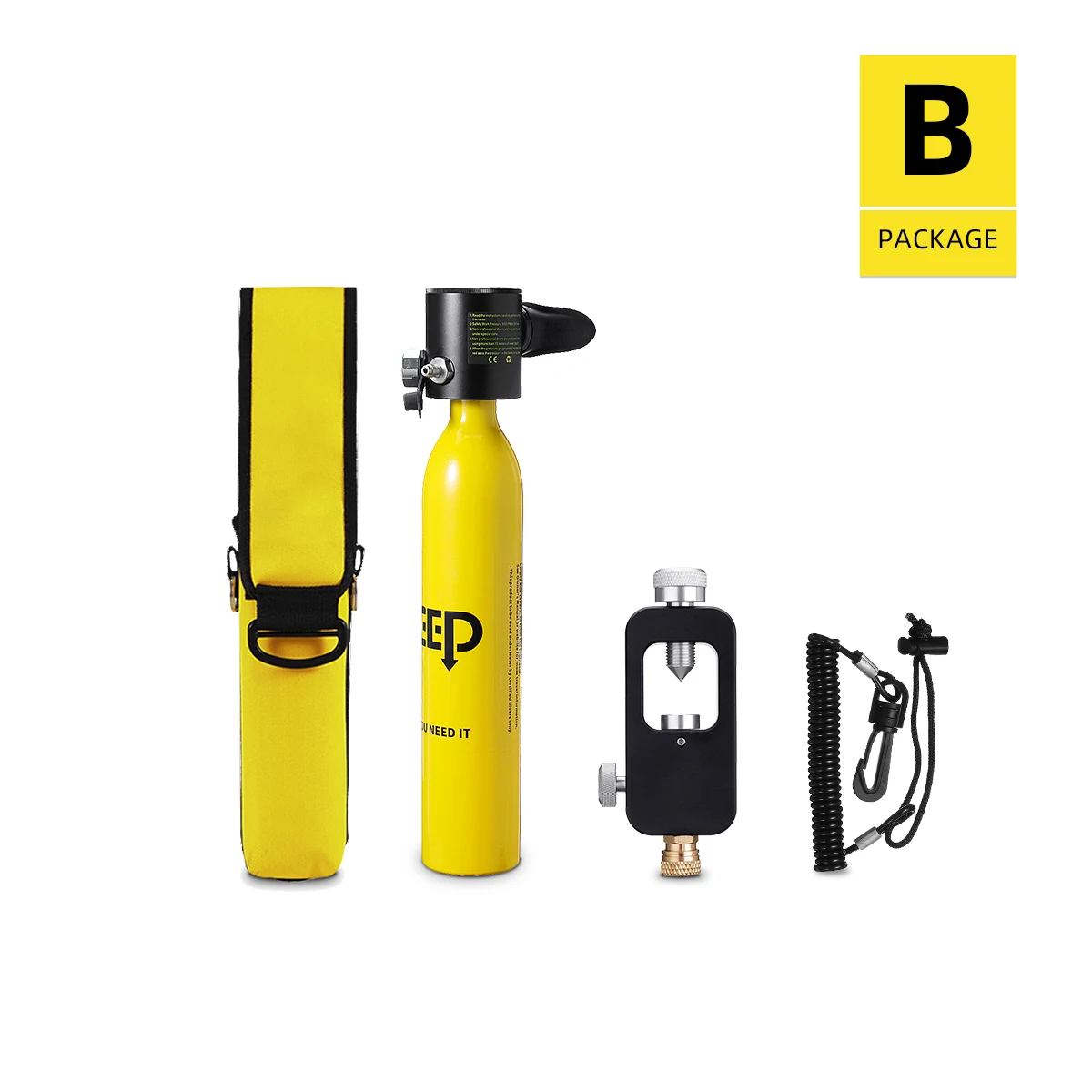 Набор EКислородный баллон-1 шт.1 x насос для накачки1 х сумка для респиратора1 x адаптер для пополнения кислородного цилиндра1 х алюминиевая коробка1 х Защитный поводок1 комплект аксессуаров1 x Руководство пользователя