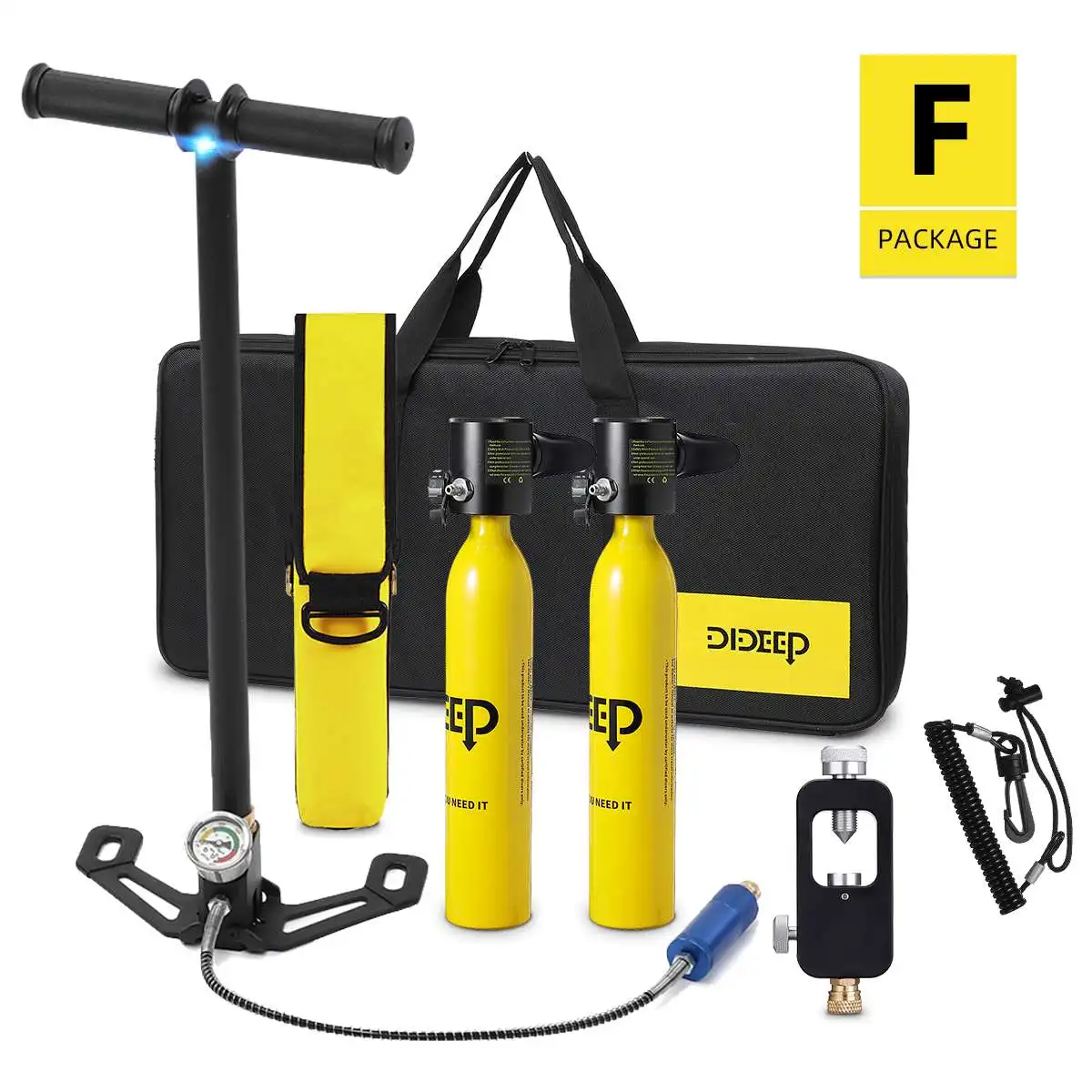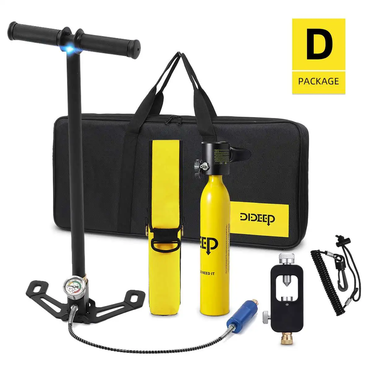 Кислородный баллон-1 шт.1 x насос для накачки1 х сумка для респиратора1 х Защитный поводок1 комплект аксессуаров1 x Руководство пользователя
