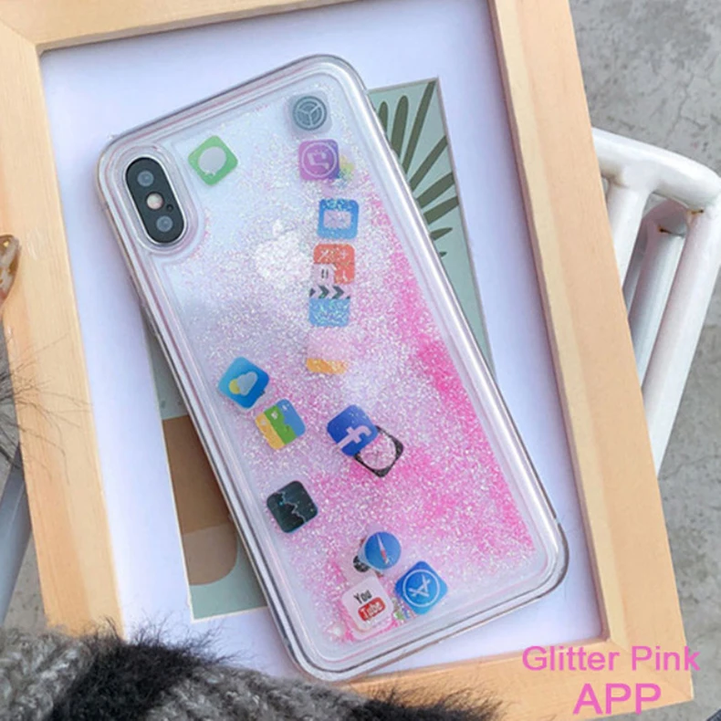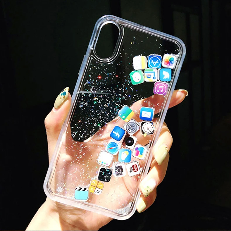 Роскошный динамический чехол с жидкими блестками для телефона iphone 12 pro max 6 7 8 plus 11 x xr xs max чехол с сыпучим песком милый чехол с иконами app