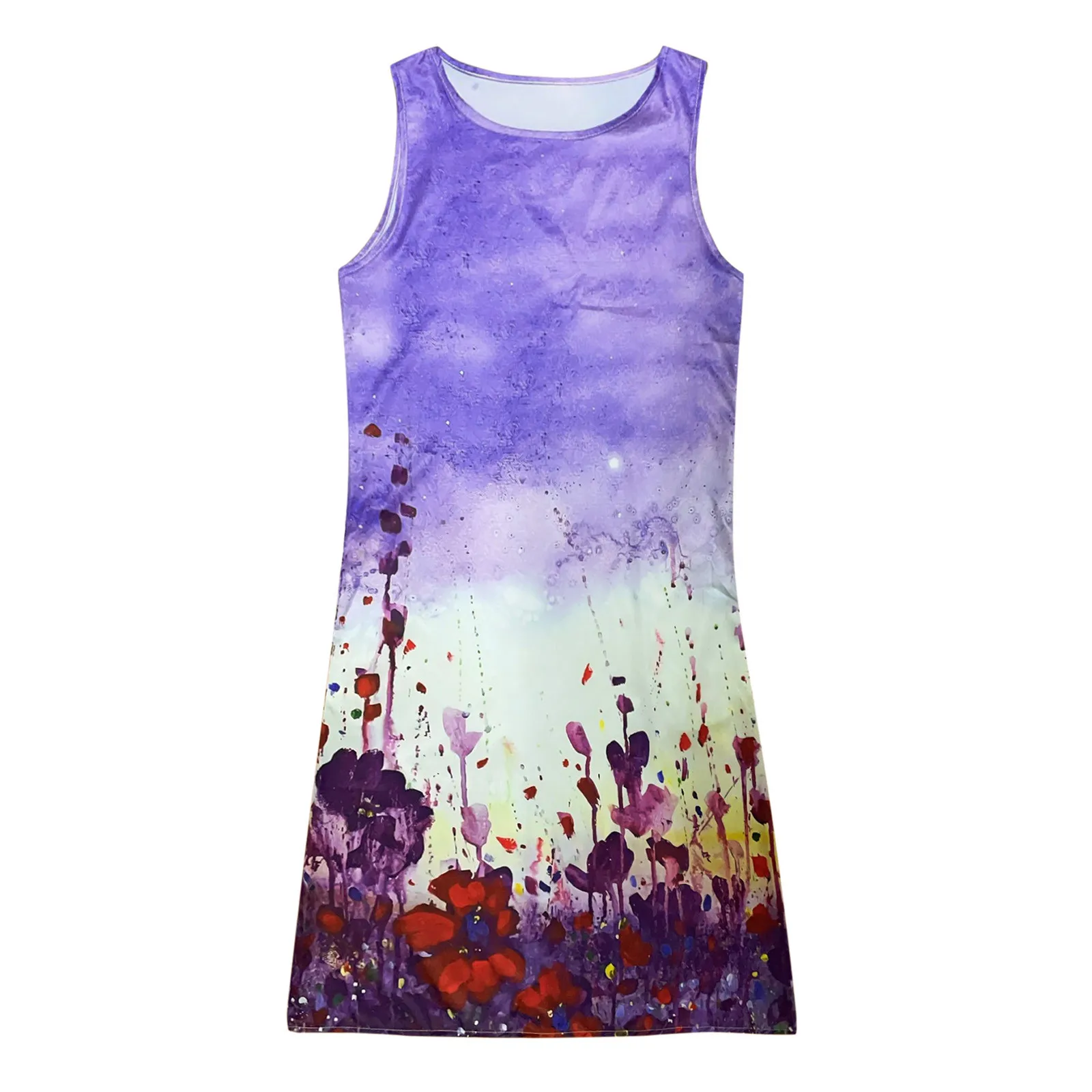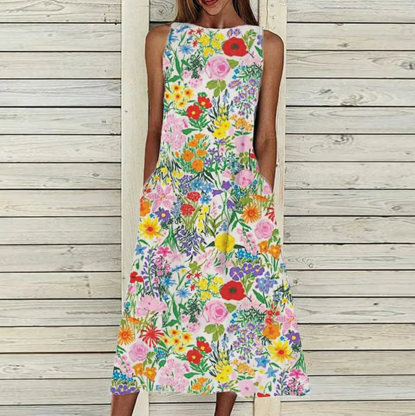 Платье женское пляжное с цветочным принтом, праздничное длинное платье макси с круглым вырезом и большими свободными карманами, одежда для вечеринок, на лето