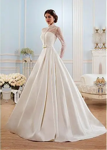 Роскошное атласное платье с высоким воротником, ТРАПЕЦИЕВИДНОЕ свадебное платье с длинным рукавом и шлейфом, свадебное платье