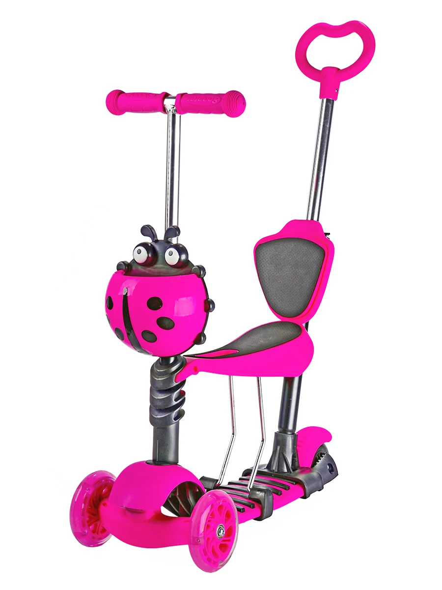 Самая быстрая доставка. Качественный пластик, цвет насыщенный, удобная сидушка и подножки. Из минусов угол поворота колес..так и не смогли кругом проехать, хоть и наклоняла самокат, возможно надо ослабить крепление.