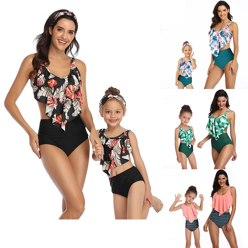 2021 бикини для маленьких девочек с принтом и высокой талией, бикини для маленьких девочек и мам с оборками, одежда для купания, семейные наряды, купальник