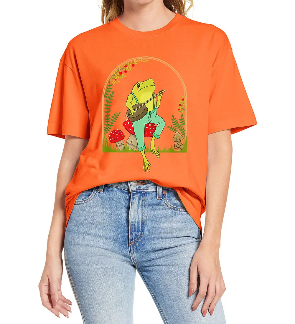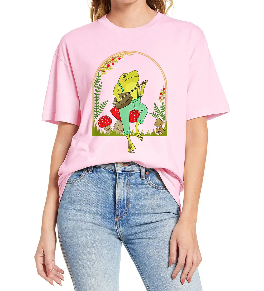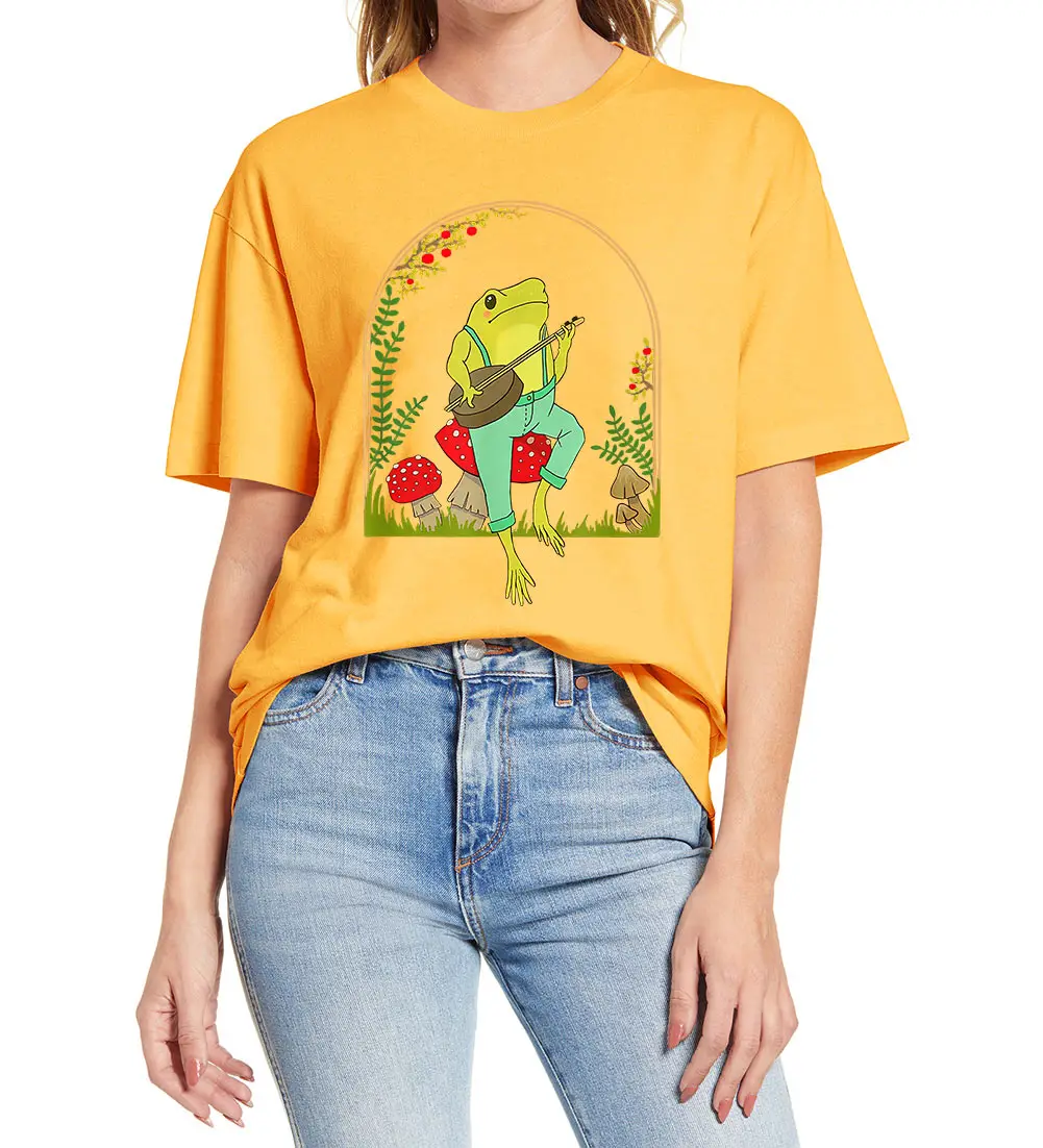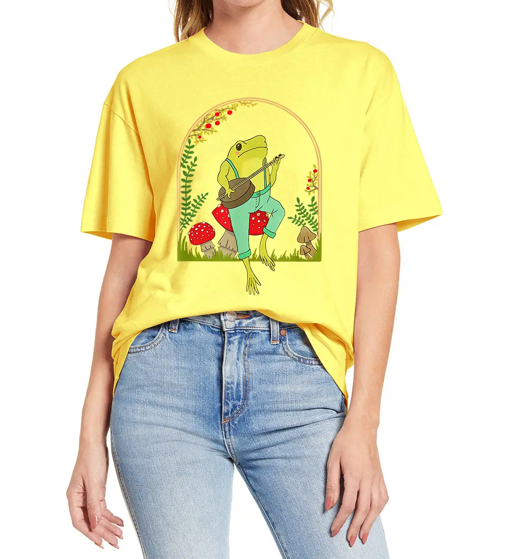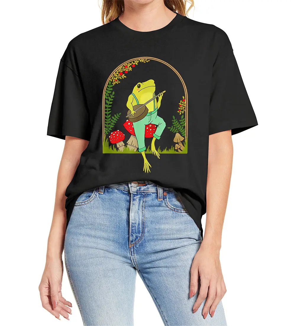 Хлопковая хлопковая футболка в эстетике Милая лягушка играющая банджо на грибах забавная Женская Новинка футболка унисекс Мягкий Топ Футболка