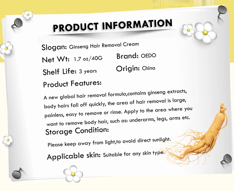 Новая глобальная формула удаления волос, содержит экстракты женьшеня, волосы на теле быстро выпадают, область удаления волос большая, безболезненная, легко удаляется или краску. Нанесите на область, на которую вы хотите удалить волосы, такие как: подмышки, ноги, подмышки.