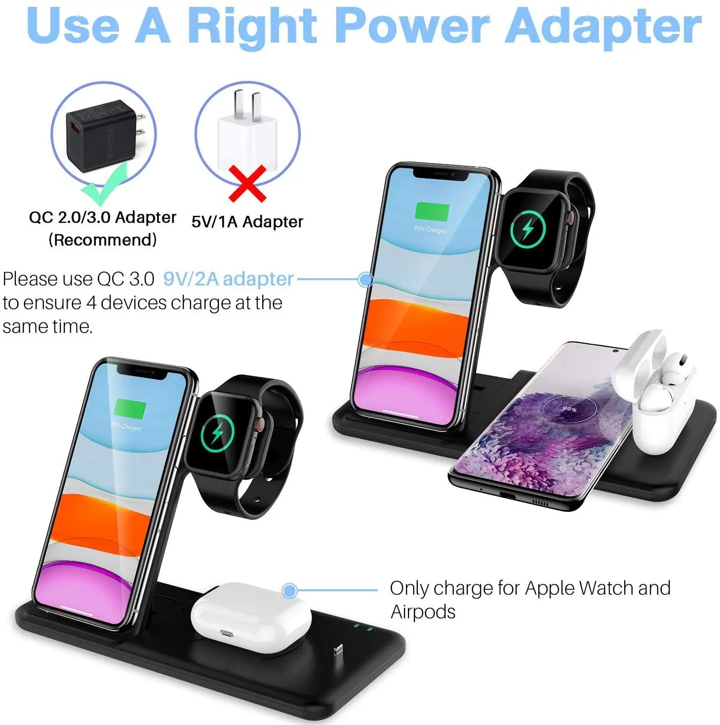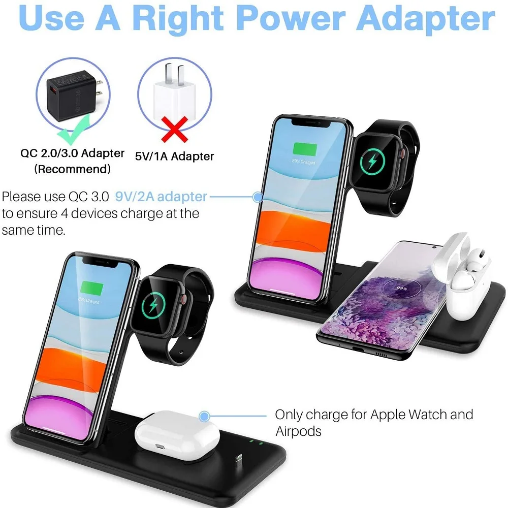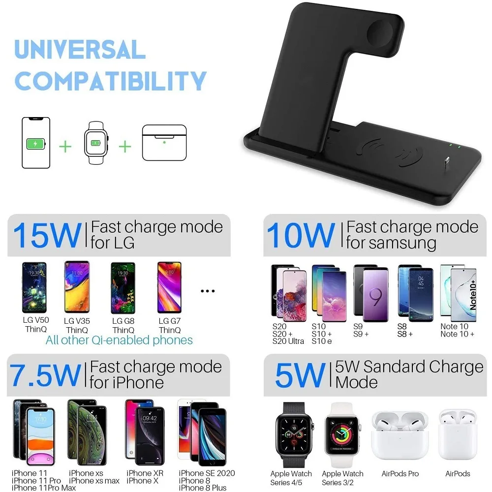 1. Это Беспроводное зарядное устройство 4-в-1 поддерживает смартфон и подходит для apple Watch 2/3/4/5/6. Более того, он может заряжать телефон, Смарт-часы, наушники в то же время, чтобы сэкономить ваше время.