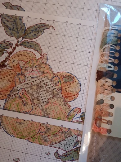 Из-за праздников доставка полтора месяца. Схема проработана, видно, что не прогон. Нитки очень приятных оттенков. Качество схс мне нравится - гладкий хлопок, без узелков, ровные одинаковые нитки. Заказала в паре с другим котиком, прислали маленький подарок - набор с двумя лягушками, что очень приятно.