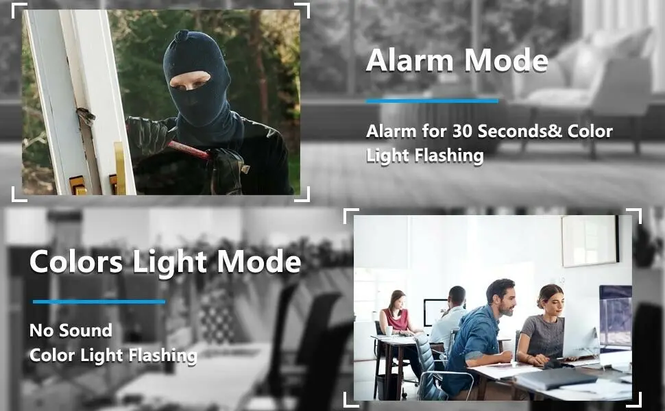 Режим сигнализации:До 113dB сигнализация, эффективно помогает удерживать нарушителя, пробуждать или оповещать вас, если дома и, возможно, оповещает о соседях.