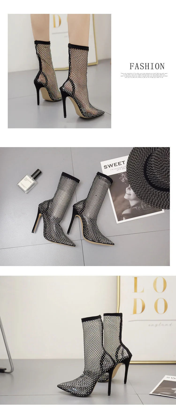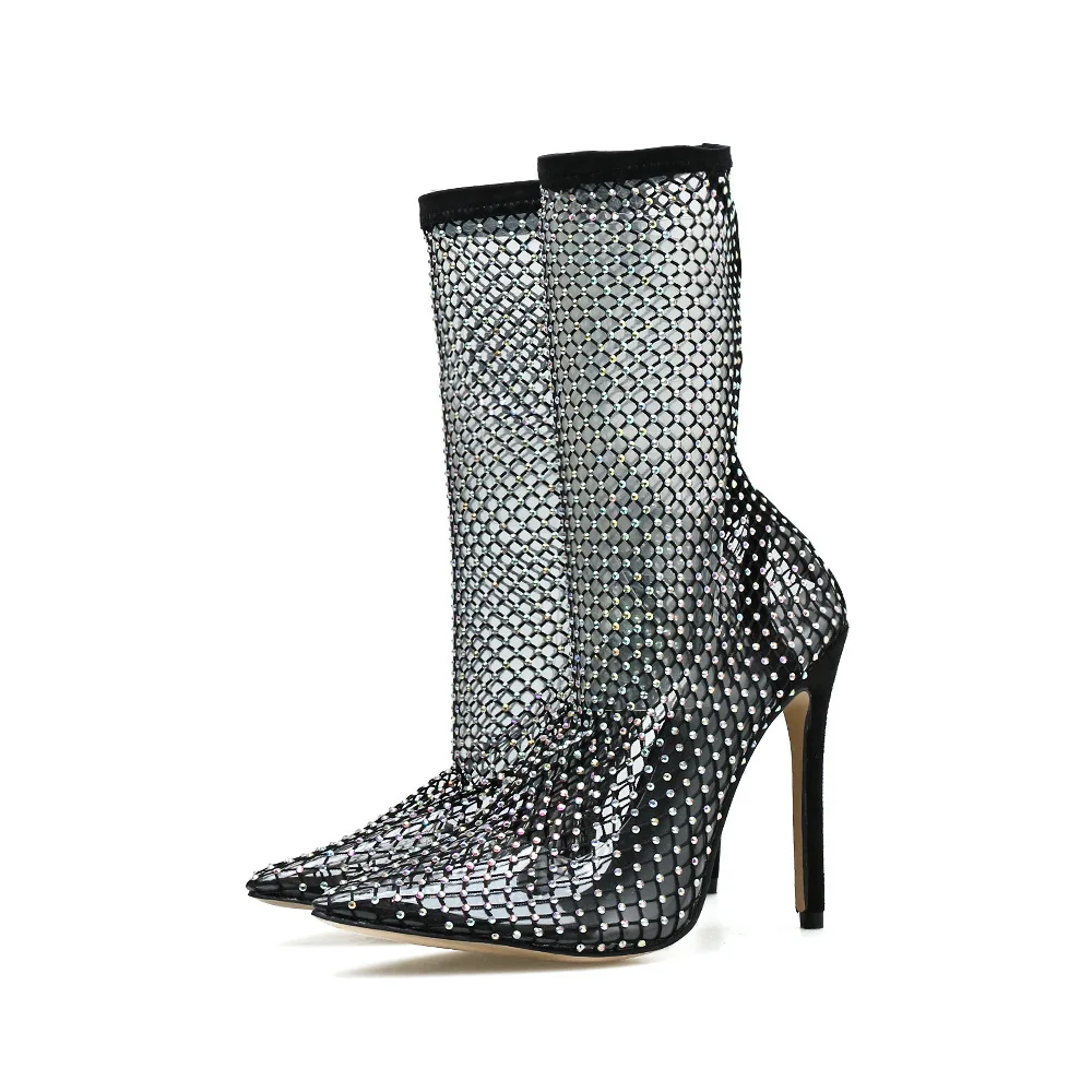 Летние блестящие стразы, сетчатые босоножки с острым носком, ботиль...