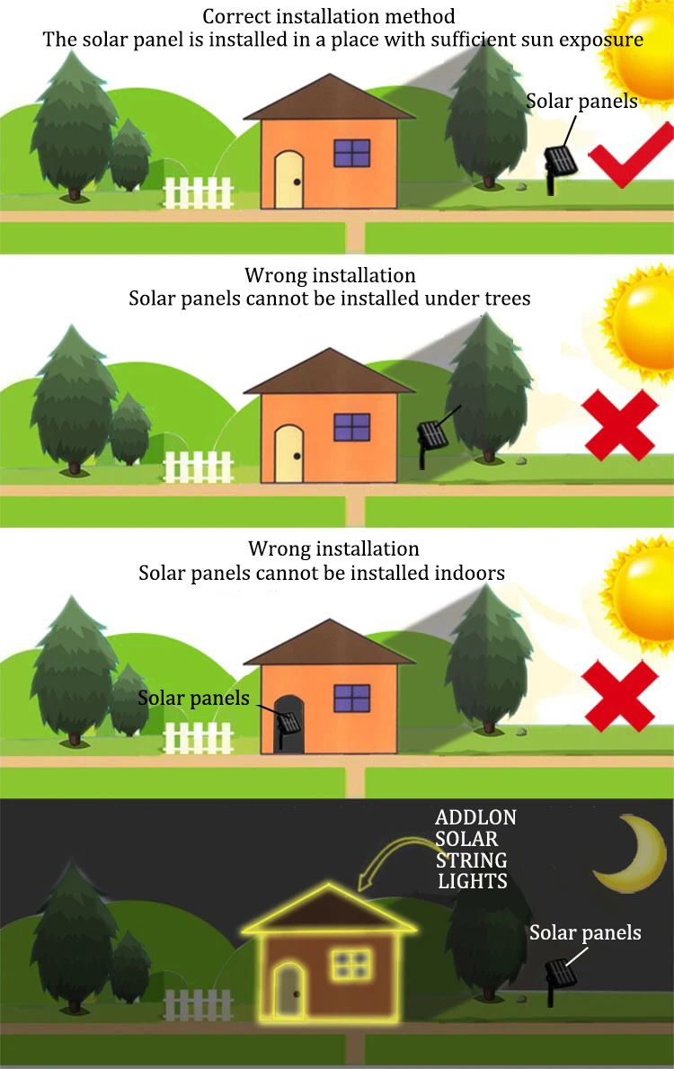 Используйте вилку для фиксации лампы и убедитесь, что солнечная панель не заблокирована другими предметами, в противном случае она не сможет эффективно заряжать. Закрепите лампу в целевом месте, например, деревья, окна магазина и т. д.