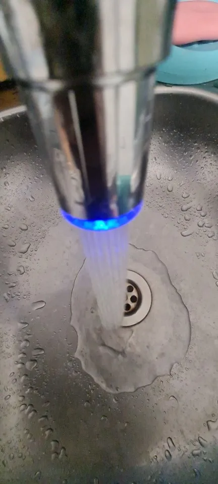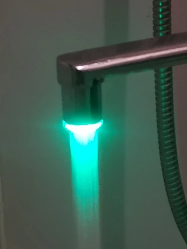 Эта штука светится одним цветом, от температуры не меняется, можно смотреть по цвету только напор воды. Китайский развод) Видимо тот, который заявлен, стоит дороже. Спасибо, что не зелёный прислали)