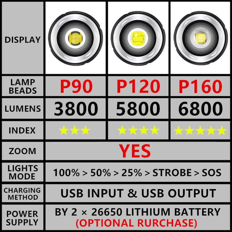 Теплая подсказка:Этот продукт доступен в двух вариантах (с батареей и без батареи),3 модели светодиодный лампы на выбор (XHP90/XHP120/XHP160)Пожалуйста, внимательно проверьте, чтобы избежать ненужных споров, спасибоПосылка включает в себя:【Без батареи 】1 × ультра яркий светодиодный фонарик (P90 или P120 или P160)1 × usb-кабель для зарядки** Аккумулятор в комплект не входит **【Полный комплект 】1 × ультра яркий светодиодный фонарик (P90 или P120 или P160)1 × usb-кабель для зарядки2 × 5000 мАч 26650 литиевая батареяПараметры продукта:Бусины лампы: 4 ядра XHP90/12 ядер XHP120/16 ядер XHP160Мощность: от 2 × 26650 литиевая батарея ed (опционально покупка)Материал: алюминиевый сплавУгол обзора: 80 °Фокусировка: Да5 режимов освещения: 100%>50%>25%> стробоскоп> SosСпециальные Особенности: зарядка через USB, поворот зума, дисплей питания, Самозащита, функция внешнего аккумулятораВремя работы: высокий светильник около 2 часов, низкий светильник около 4 часовВодонепроницаемый Рейтинг: IPX-5 (не может Diveing)Максимальный диапазон: около 500 мРазмер: 245*50*35 мм