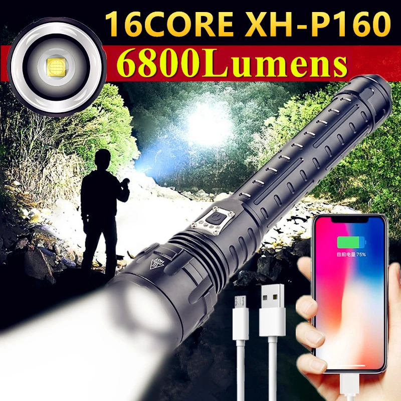 Светодиодный фонарик с зарядкой от USB, 16 ядер, XHP160, мощный уличный фонарь высокой мощности для кемпинга, масштабируемый тактический охотничий фонарь 26650