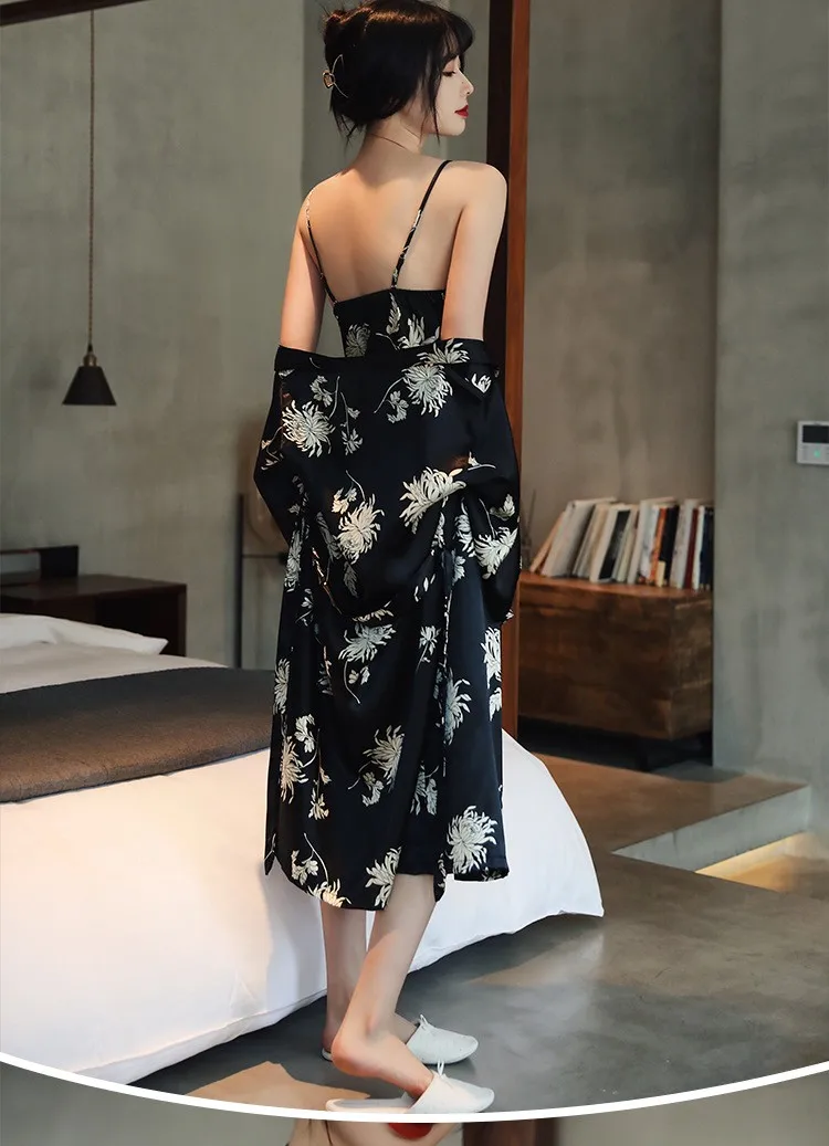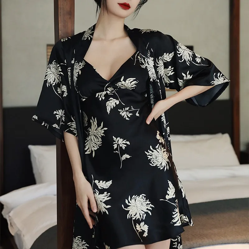Черный Для женщин, одежда для сна, комплект из 2 предметов, свободный комплект для девочек атласное платье с принтом для цветочное кимоно платье сексуальный халат ночная рубашка из искусственного шелка белье Ночная рубашка
