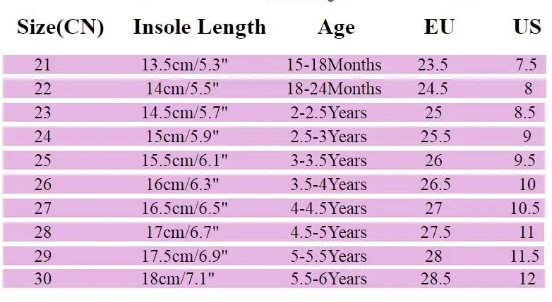 Советы покупателя amozaeОптовая и Прямая поставка приветствуются?Для оптовой продажи мы предлагаем скидку на бесплатную Экспресс-доставку, которая занимает всего 3-7 дней.Для дропшиппинг, мы можем отправить товары к вашим клиентам сразу и не оставит информацию о нас если вы запрашиваете. Как я могу взять свою посылку?Вы можете отследить свою посылку на следующем веб-сайте, используя свой номер отслеживания: www.17track.net/en (скопируйте в браузер, чтобы открыть)Таблица размеровПоскольку все размеры детской обуви отличаются, при заказе детской обуви вы должны соответствовать нашим размерам и внутренней длине.Согласно длине стельки. (длина стельки = длина стопы + 1 см)Американский размер не является стандартным, просто удобно для вас сделать заказ.Удобная длина стопы составляет около 1 см.И из-за длительного времени доставки авиа-отправление Почты Китая и ребенок быстро вырастет, пожалуйста, выберите обувь большего размера для вашего ребенка.Пожалуйста, выберите правильный размер.Вся обувь будет отправлена с пузырчатыми сумками, без коробок!