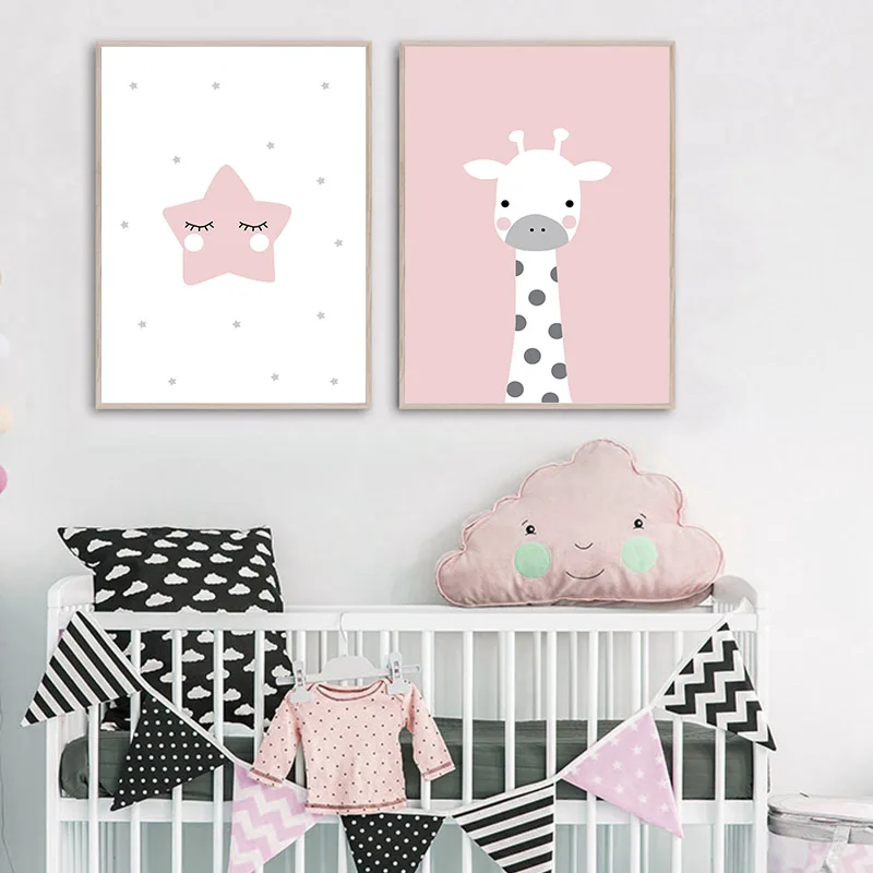 Настенная картина для детской комнаты, постер на холсте с изображением розового мультяшного животного, жирафа, кролика, декоративная картина в скандинавском стиле для детской комнаты, спальни