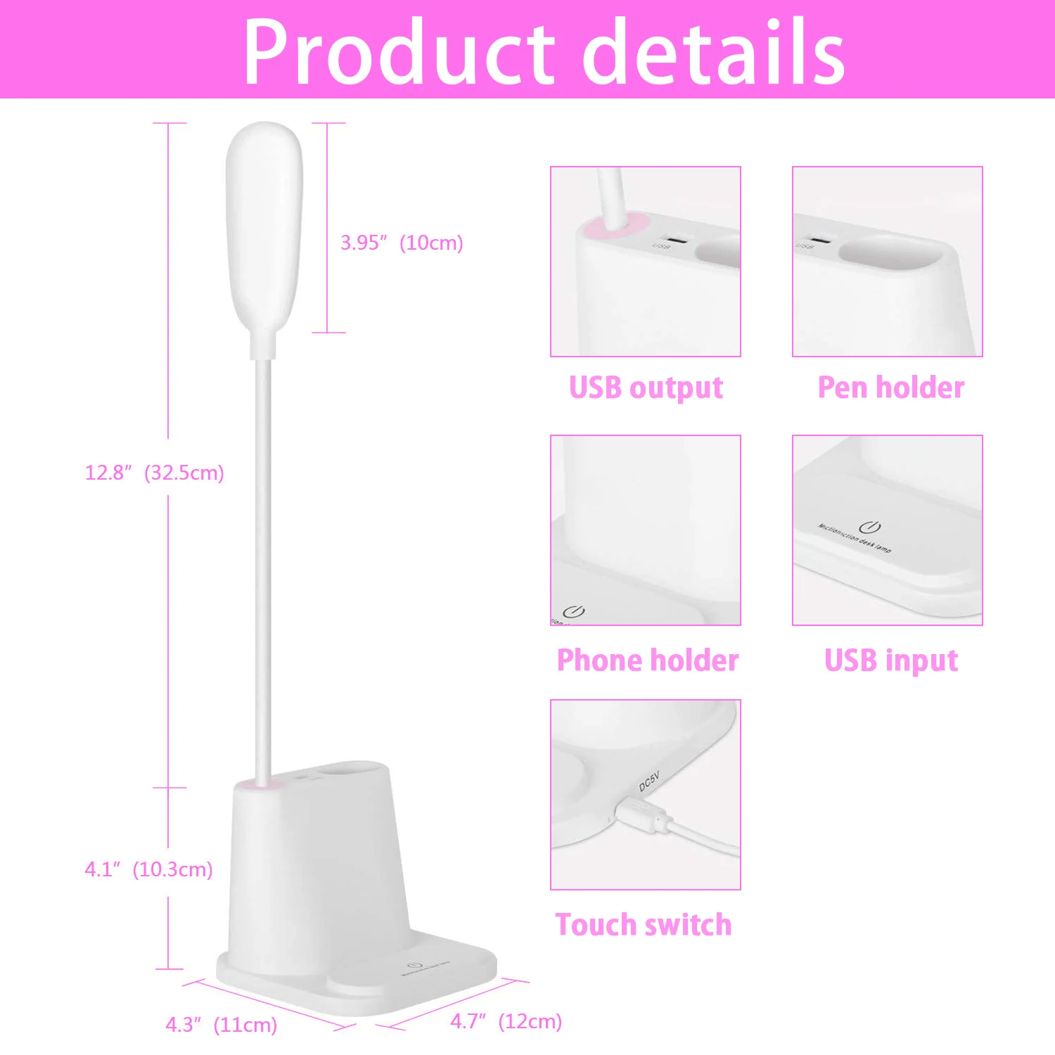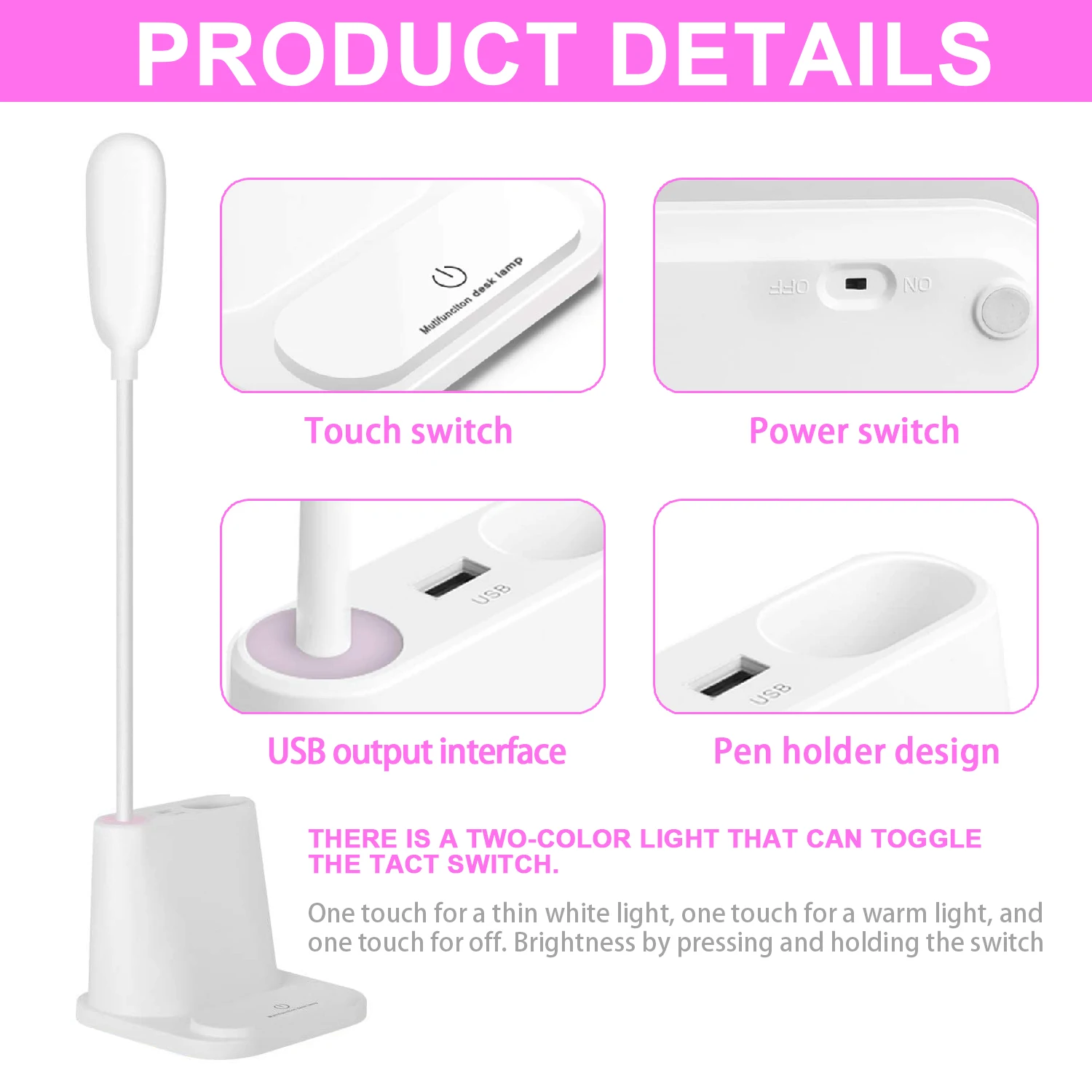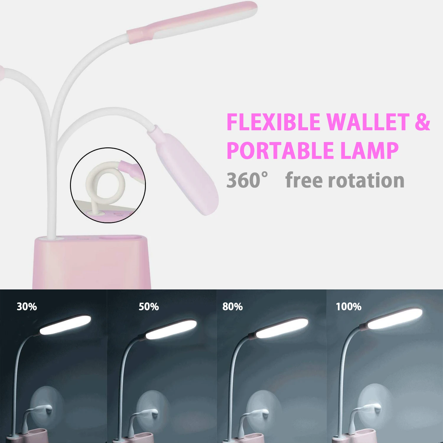 2. Многофункциональная настольная лампа не только как настольная лампа, базовая конструкция может использоваться как держатель Мобильный телефон, держатель для ручек для удобного хранения. Порт USB может обеспечивать питание для электронных продуктов, таких как мобильные телефоны, ночники, портативные вентиляторы и т. д.