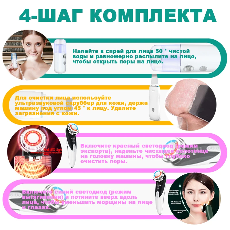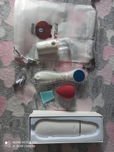 Заказ пришёл быстро, описание точное, коробочки не помятые, ультро звуковой аппарат чистит как и описанно, покупкой очень довольна, так как у меня расширенные поры и жирный тип кожи, после чистки лицо стало намного свежее, подтянутее, и поры стали меньше, вообщем сразу эффект почувствовала, но и конечно же увидела на скребке всю ту грязь готорую обычно не удается достать с помощью умывалок, масок. Так же был в наборе распылитель, очень понравился, лёгкий прохладный пар, можно брать в жару, пробовали в нагретой от солнца машине, включили кондиционер и его, машина почти сразу наполнилась приятной свежестью, на тело тоже здорово освежает, на счет масажера для лица с синим и красным светом пока ничего не понятно, пользуюсь буду смотреть дальше эффект
