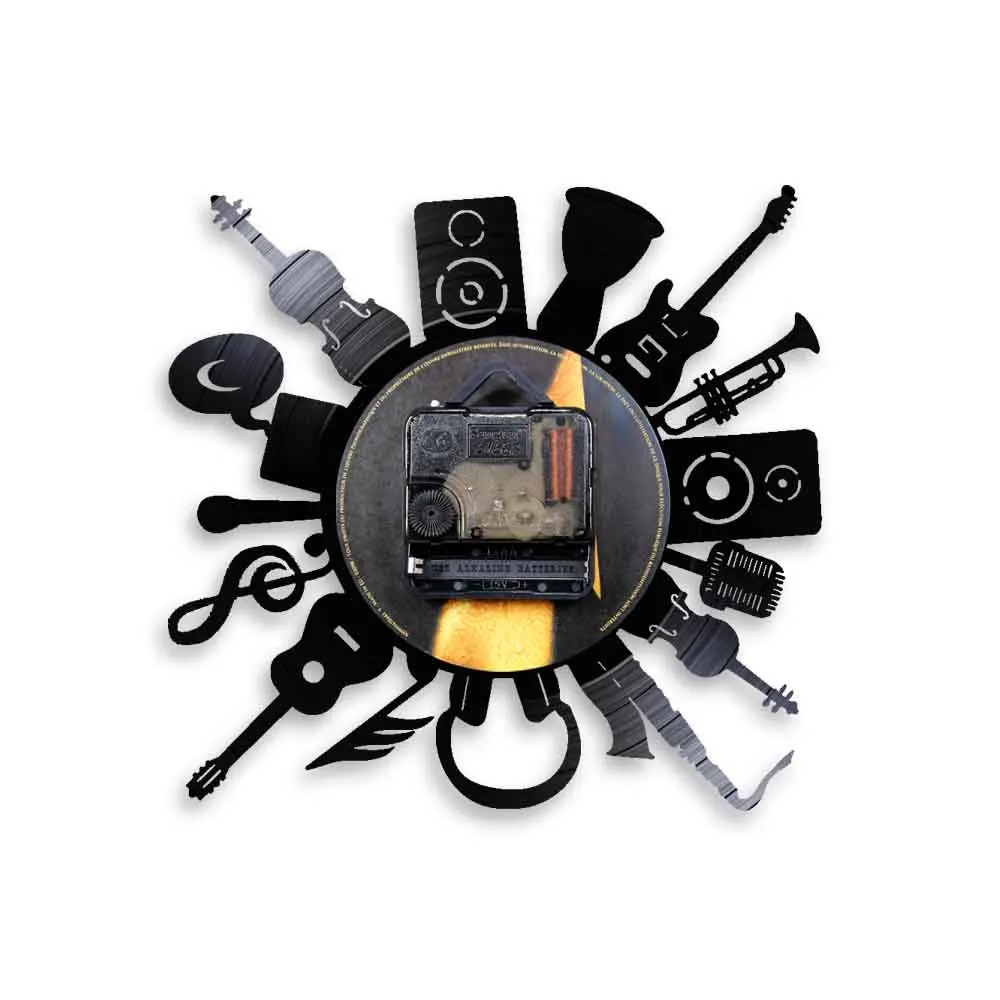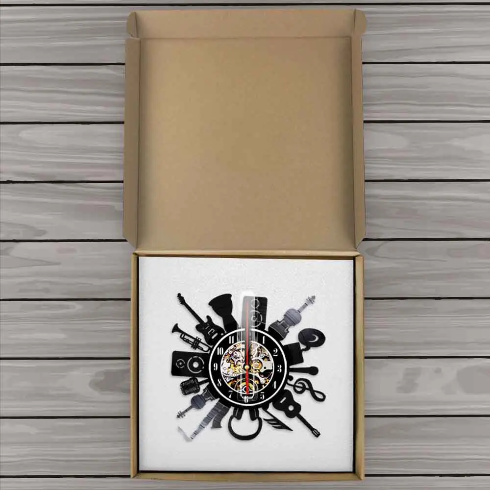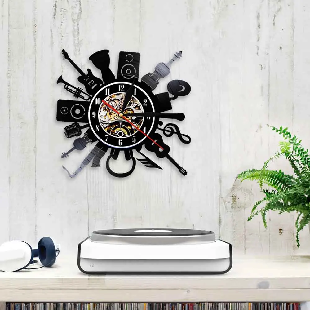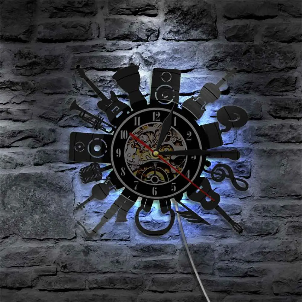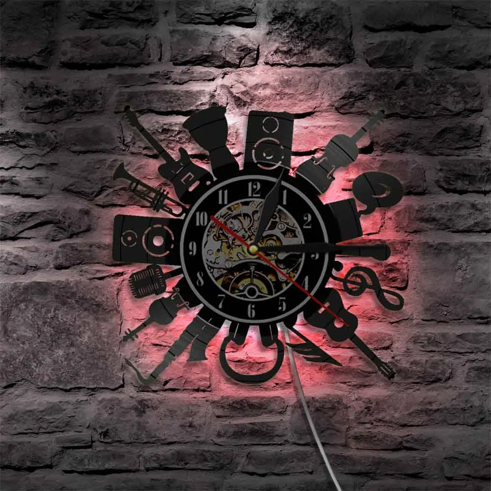 Настенные часы с музыкальными инструментами, домашний декор, современный дизайн, настенный светодиодный светильник для гитары, в стиле Рок н-ролл, винтажная виниловая пластина, Настенный декор, часы