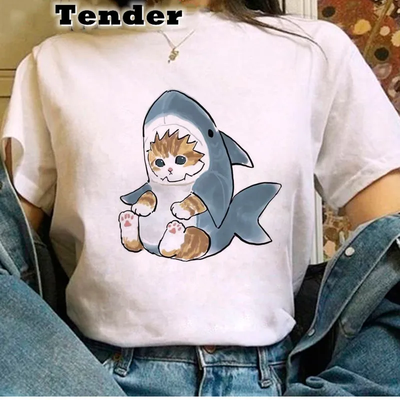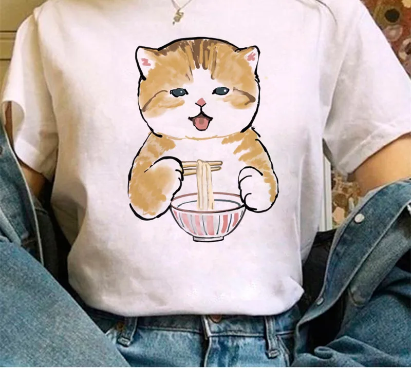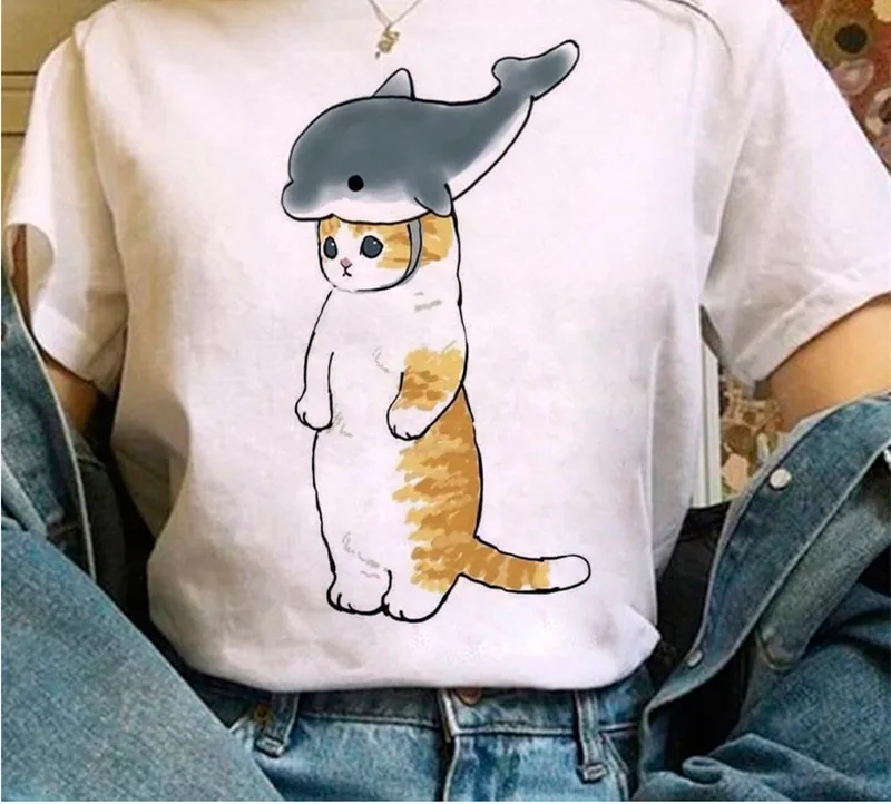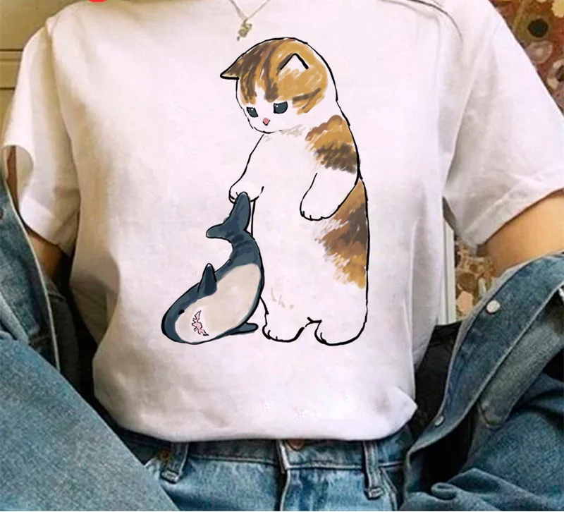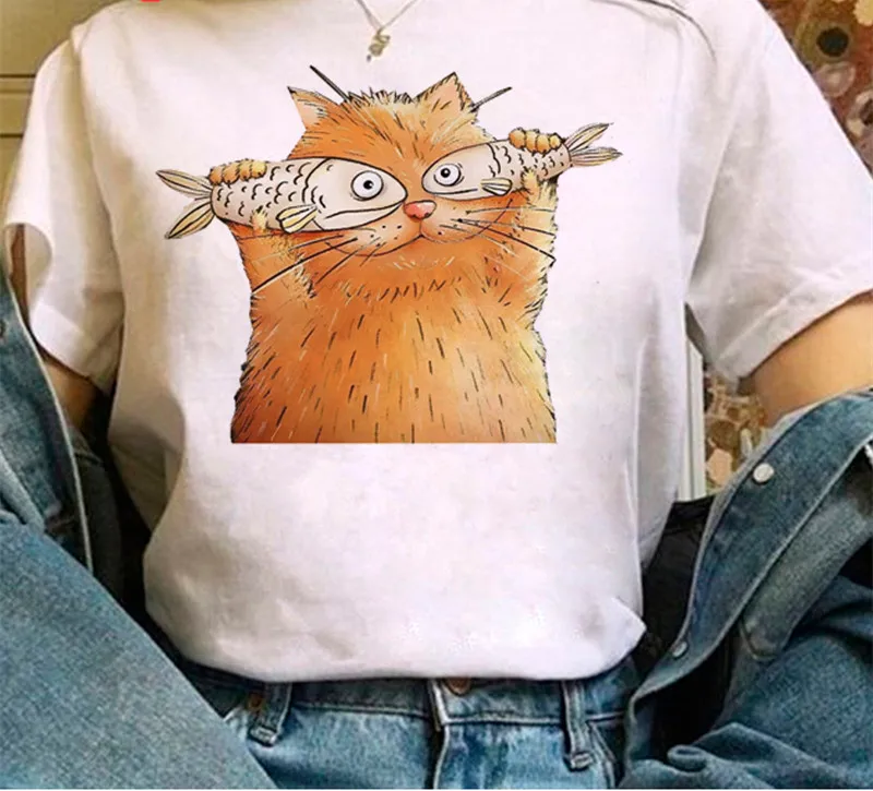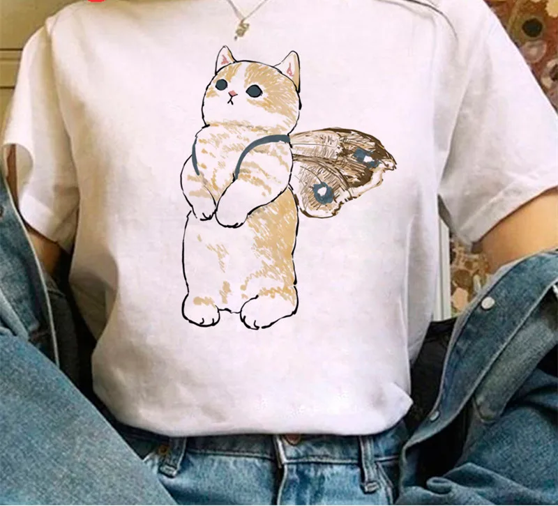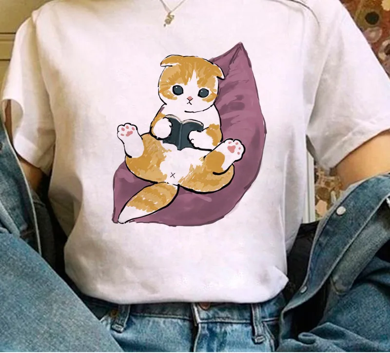 Футболка женская с мультяшным котом, смешной Графический Топ в стиле Харадзюку, футболка в Корейском стиле, кавайная
