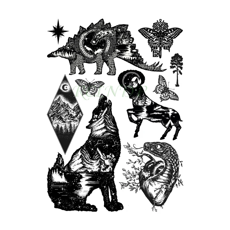 Водостойкая Временная тату-наклейка, динозавр, Бабочка, лес, волк, змея, звезда, луна, флэш-тату, искусственная тату для мужчин и женщин