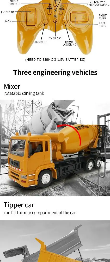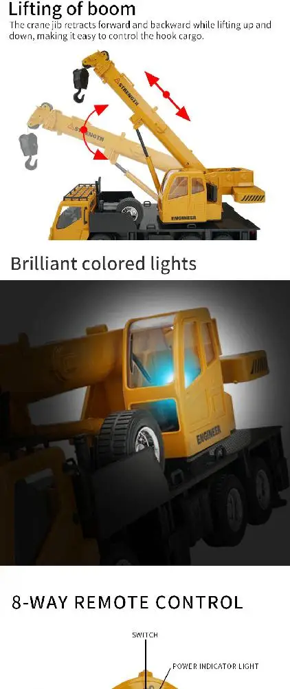 Расстояние дистанционного управления: 50 м;Время зарядки: 180 минут;Продукт: Радиоуправляемый кран грузовика;Материалы: абс + электронный;Корпус аккумулятора: 3,6 V 700mah перезаряжаемый аккумулятор;Частота дистанционного управления: 2,4 г;Время использования: 25 минут;Размер продукта: 32,3*9,3*10,7 см;