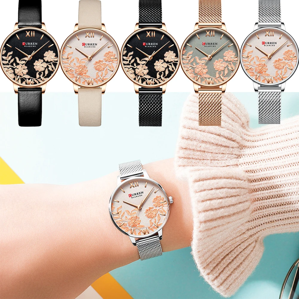 CURREN Модные женские часы из нержавеющей стали с сетчатым ремешком очаровательные Наручные повседневные кварцевые наручные часы с цветком