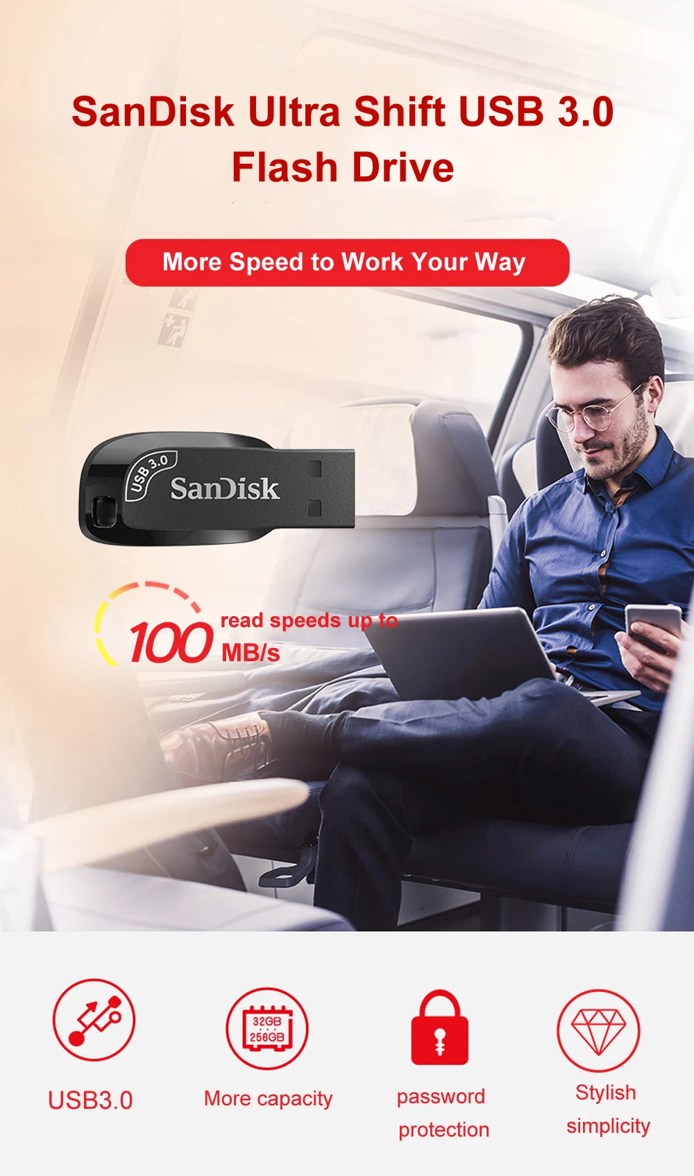Держите свой цифровой мир под рукой с помощью USB SanDisk Ultra Shift. Со скоростью чтения до 100 МБ/с., вы можете тратьте меньше времени на ожидание и больше времени с акцентом на том, что важно для вас.