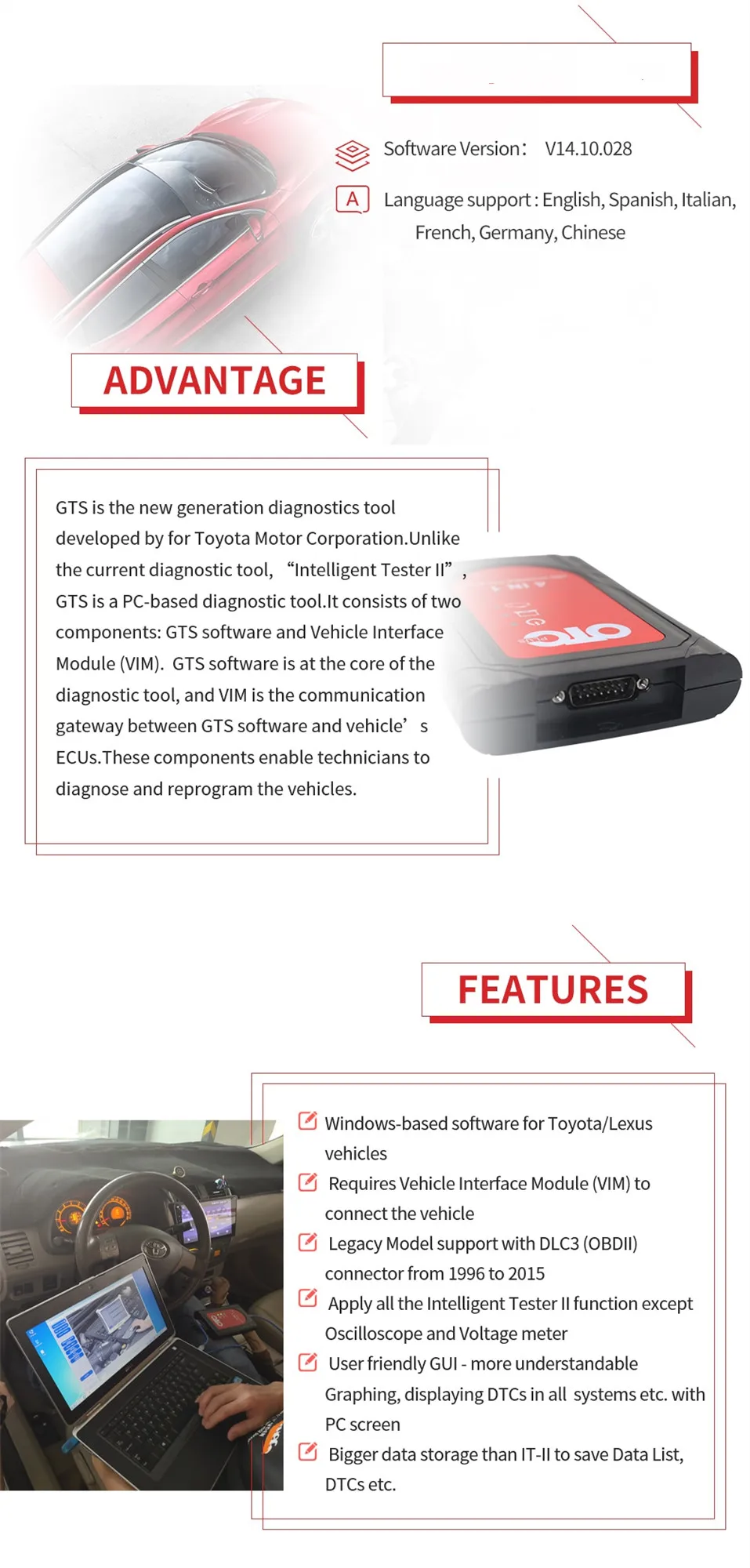 2. Он состоит из двух компонентов: программного обеспечения GTS и модуля интерфейса автомобиля (VIM). Программное обеспечение GTS лежит в основе диагностического инструмента, а VIM-шлюз связи между программным обеспечением GTS и ЭБУ автомобиля. Эти компоненты позволяют техническим специалистам диагностировать и перепрограммировать автомобили.