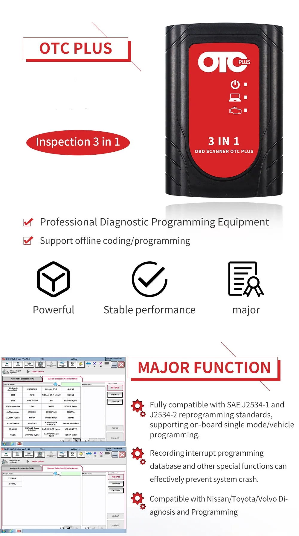 Описание:Новейший OTC PLUS 3 в 1 GTS TIS3 OTC сканер-это новое профессиональное диагностическое устройство программирования для Toyota для Nissan и Volvo, которое может поддерживать автономное кодирование/программирование, мощное, стабильное функционирование, профессиональный интеллект.
