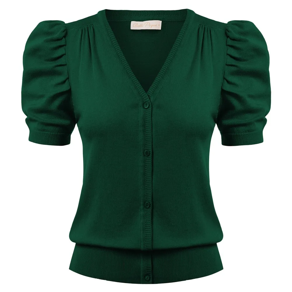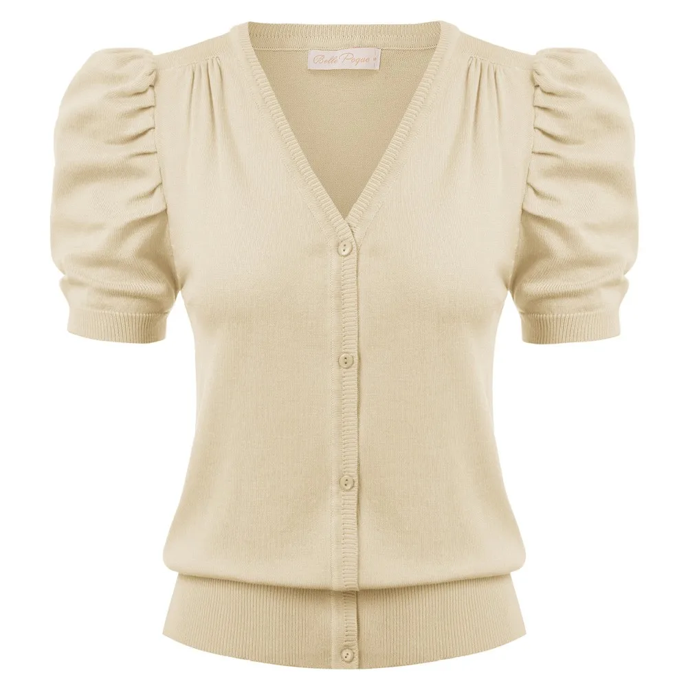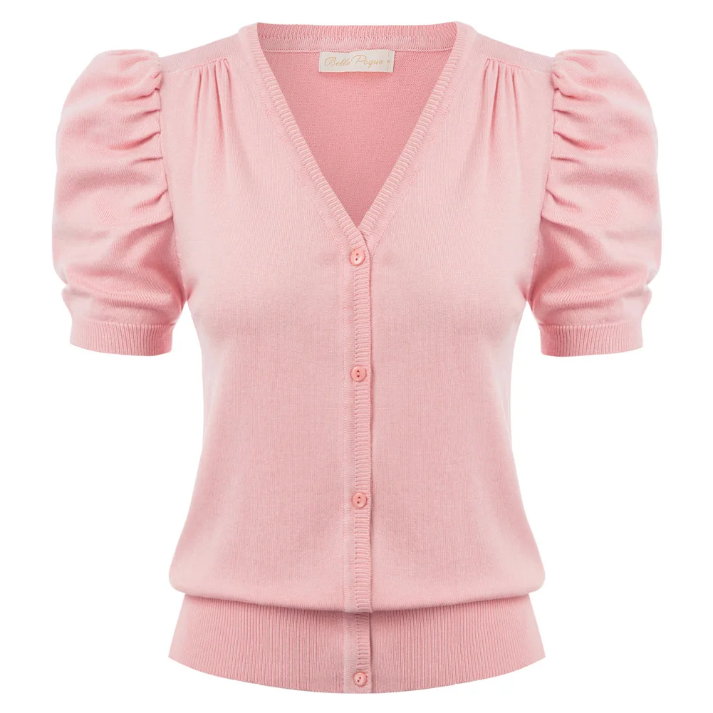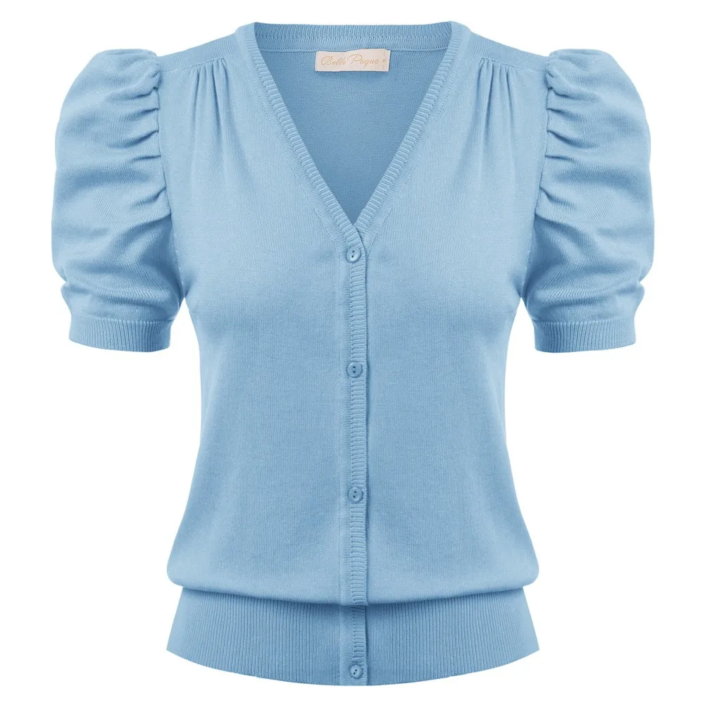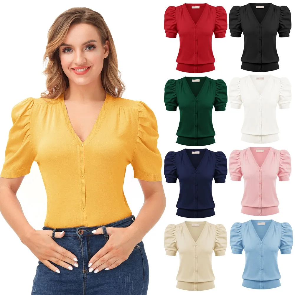 Belle Poque женские летние топы, футболка с короткими рукавами-буфами и кардиган, вязаная одежда вязаные топы мехом однотонные мягкие тонкие v-образный Вырез Винтаж