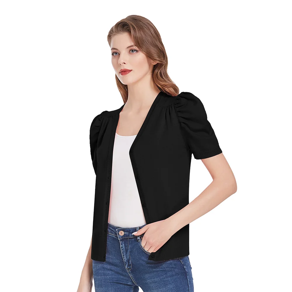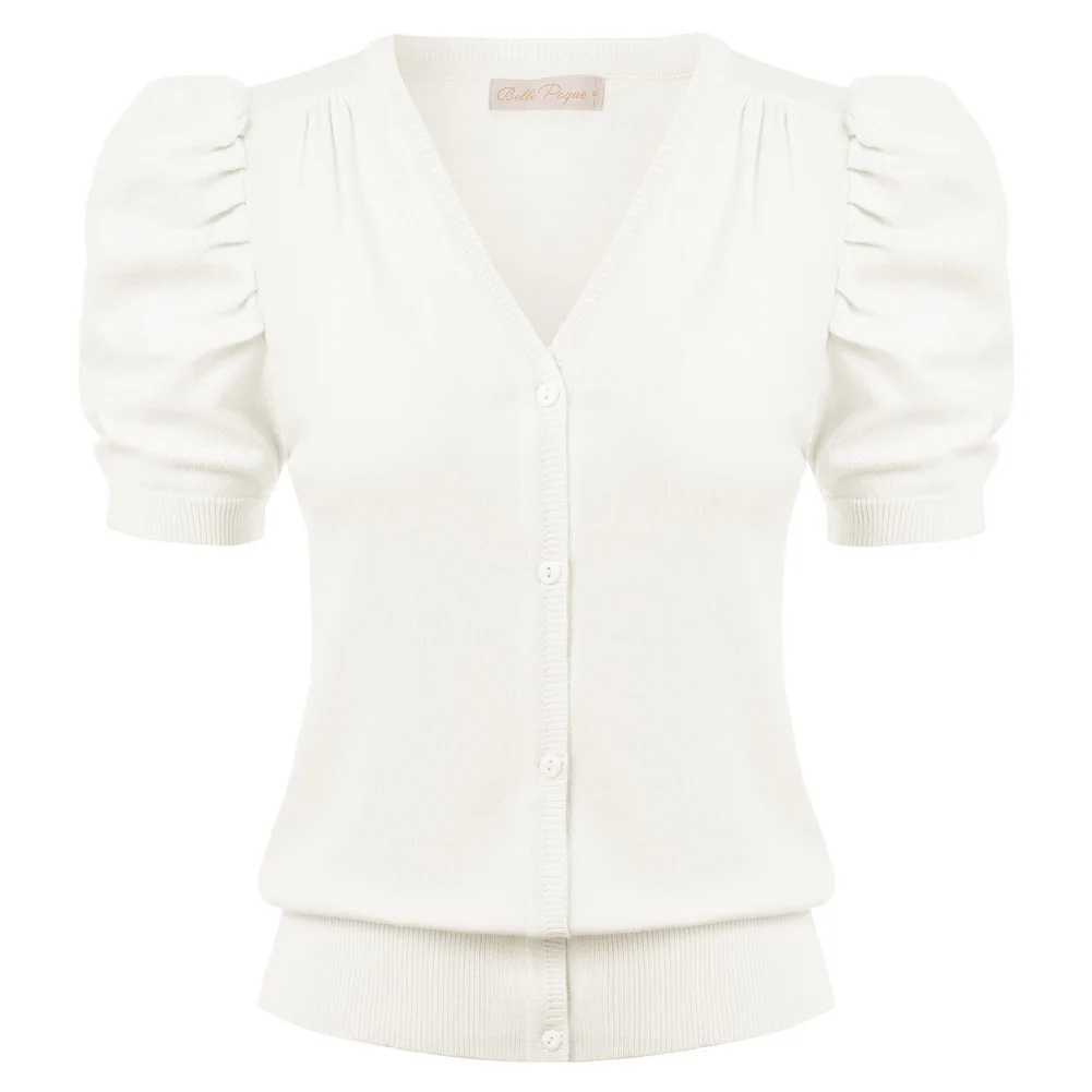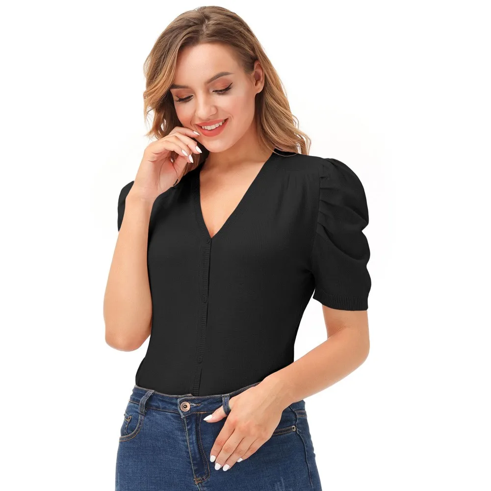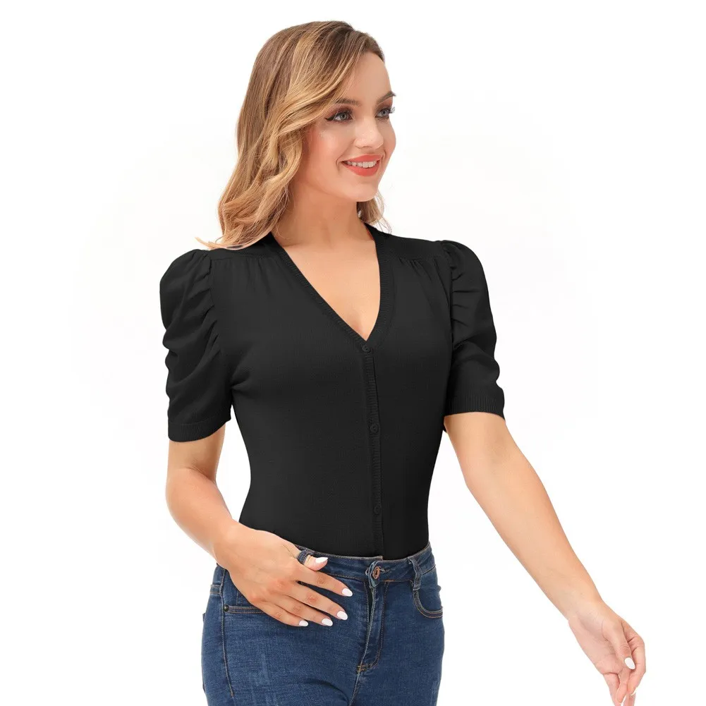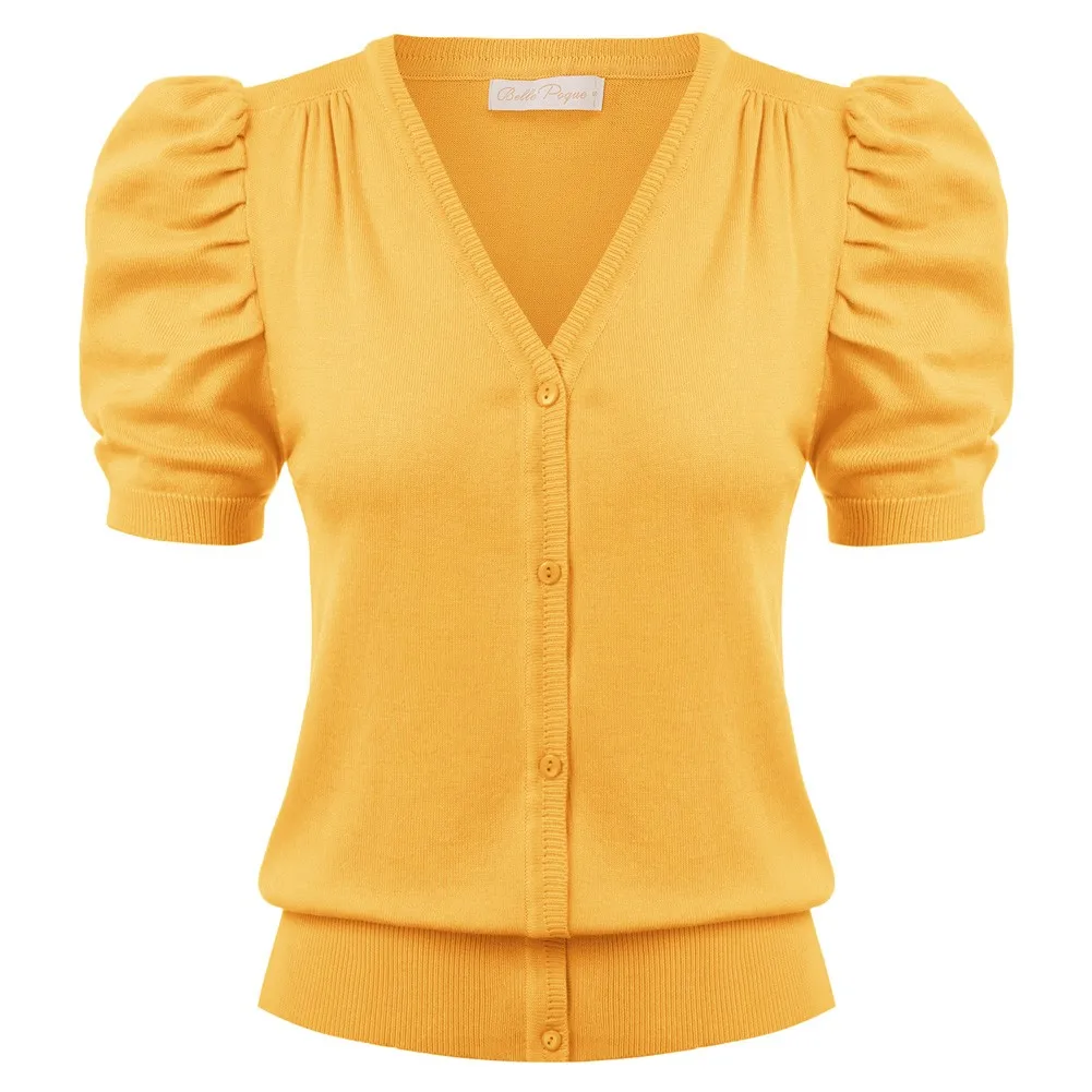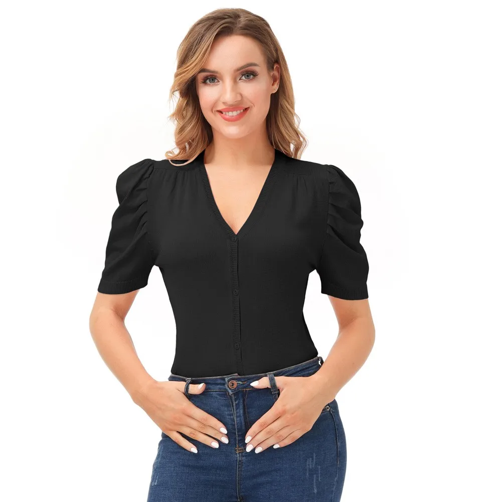 Belle Poque женские летние топы, футболка с короткими рукавами-буфами и кардиган, вязаная одежда вязаные топы мехом однотонные мягкие тонкие v-образный Вырез Винтаж