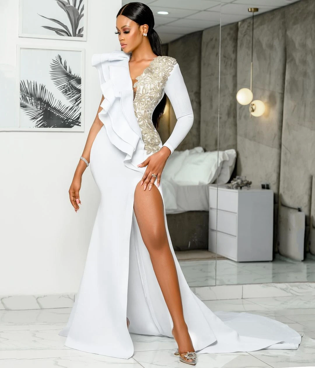 Очаровательные Белые вечерние платья, с длинным рукавом, на одно плечо, кружевное, с разрезом спереди, стрейчевые, со шлейфом, для выпускного